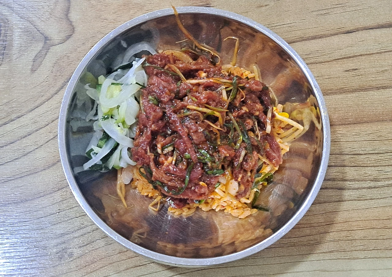 열린 문 안으로 들어서서 좌측 맨 끝 구석진 4인 좌식 식탁으로 안내받고 앉는다. 주문도 바로 받는다. 남자 손님은 육회비빔밥 곱빼기를 시키며 서로 맛보자며 모듬순대도 주문한다. 버스에서 같이 내렸던 여자 손님과 나는 육회비빔밥 보통을 주문한다.