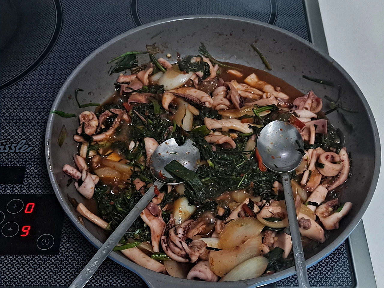 손질한 오징어에 텃밭의 채소를 넣고 갖은 양념하여 볶는다. 들들 볶아야 맛깔나다.
