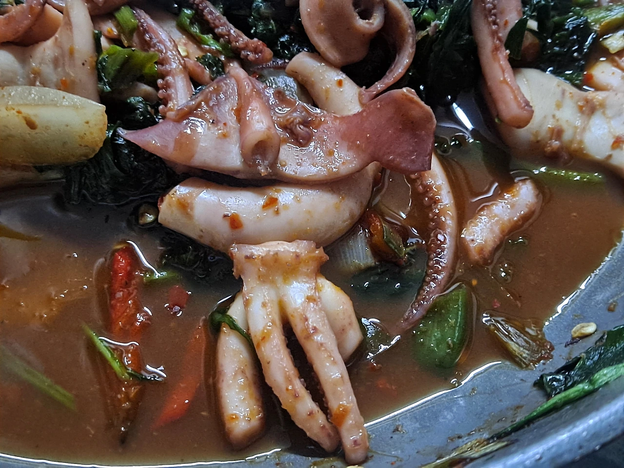 오징어 한 마리가 푸른 부추 바다 위에서 합쳐지며 입안을 헤엄쳐 다닌다.