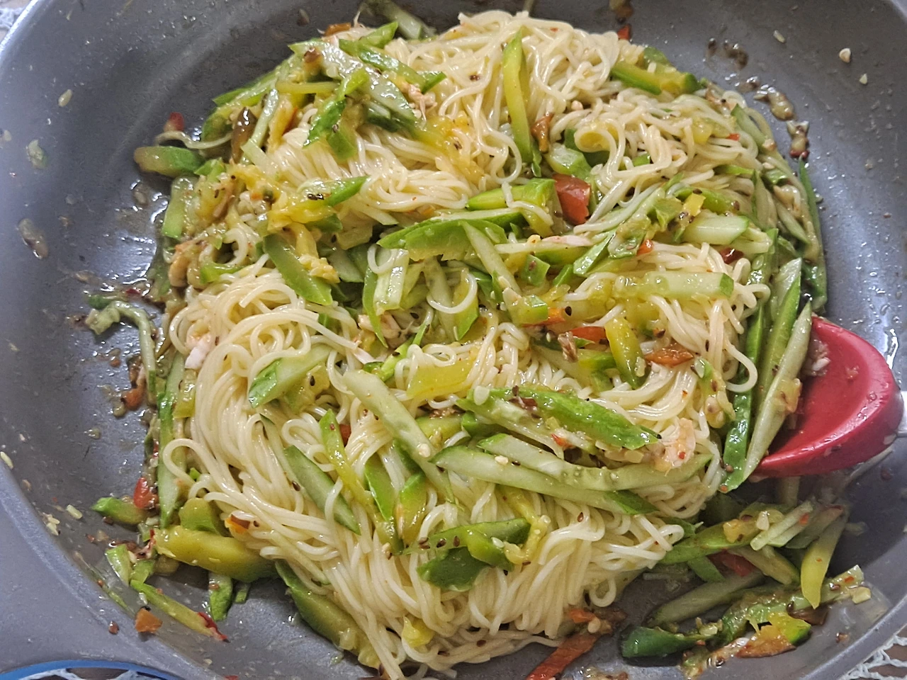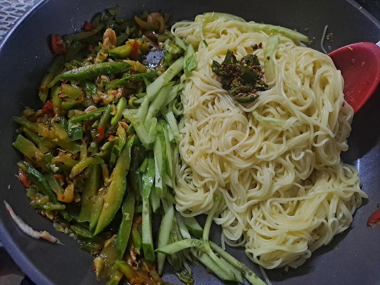 애호박볶음이 있는 프라이팬에 채 썬 오이와 삶아 둔 소면을 담는다. 간장에 청양고추, 깨, 파, 참기름 등을 넣은 간장양념을 소면 위에 약간 끼얹는다. 젓가락으로 골고루 뒤섞는다. 호박 국수가 완성된다.