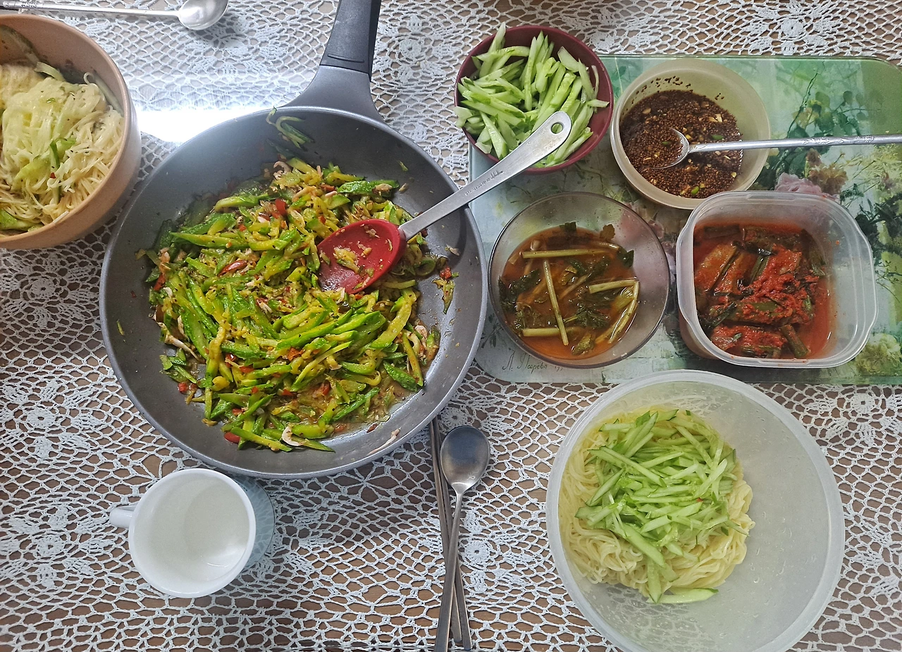 일요일 점심은 밥 대신 주로 국수를 먹는다. 특히 여름철엔 호박 국수를 즐겨 먹는다. 호박 국수의 재료는 대문 위 덩굴에 자라는 애호박과 텃밭의 오이다. 대표적인 여름 채소로 한여름 뙤약볕 아래서도 푸름을 잃지 않고 자라는 억센 생명력을 뽐낸다.