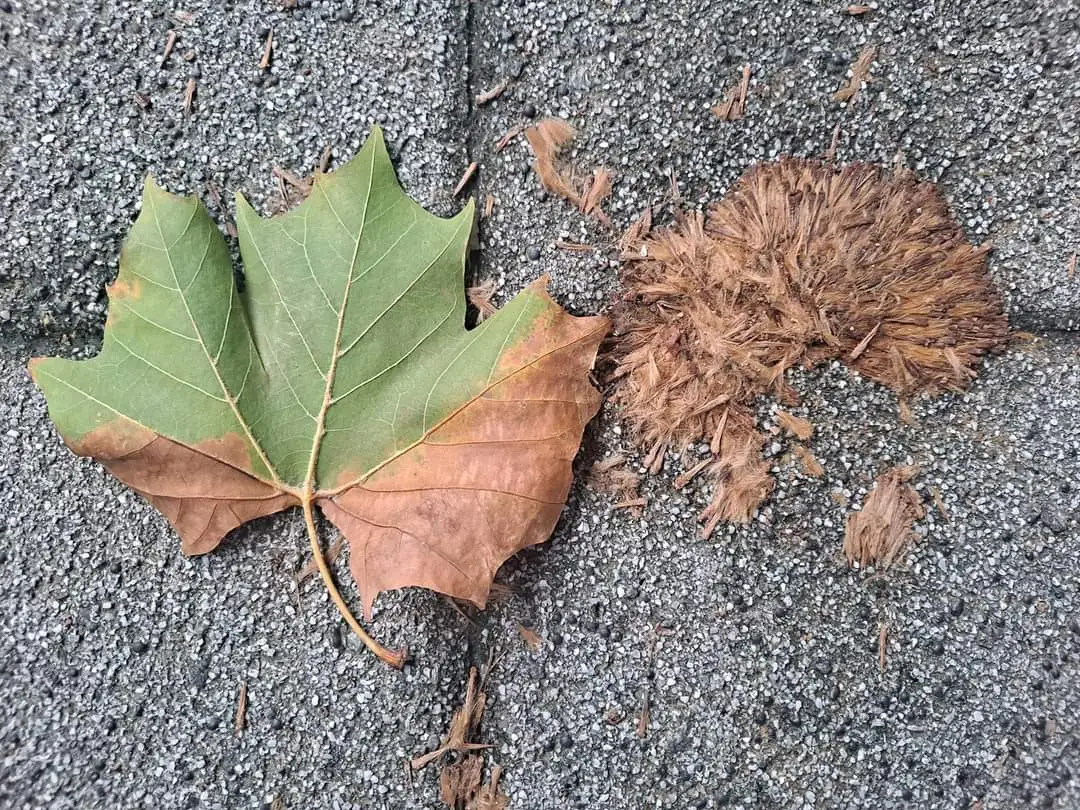 플라타너스(양버즘나무) 나뭇잎과 열매 안 씨앗이다.