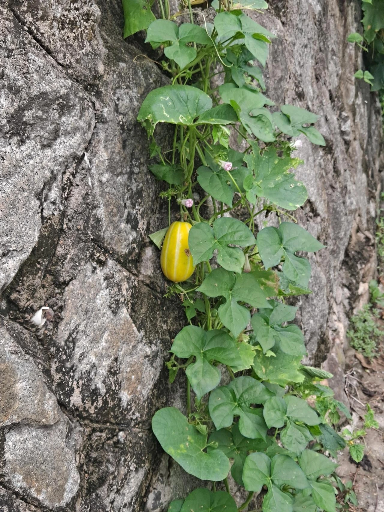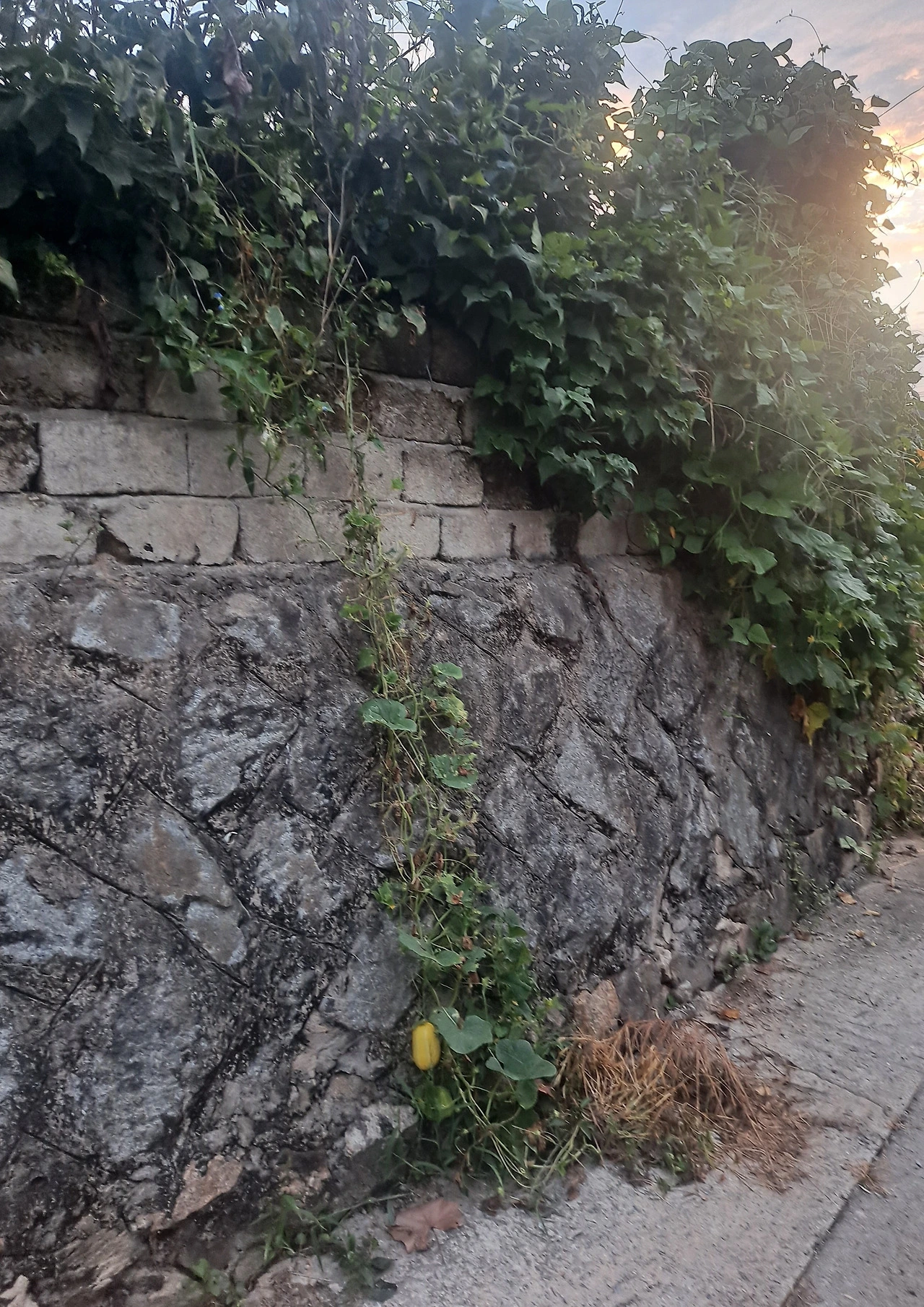 비가 내리고 무더위가 수그러들었다. 집으로 오가는 골목길 담벼락에 참외가 달려 있다.