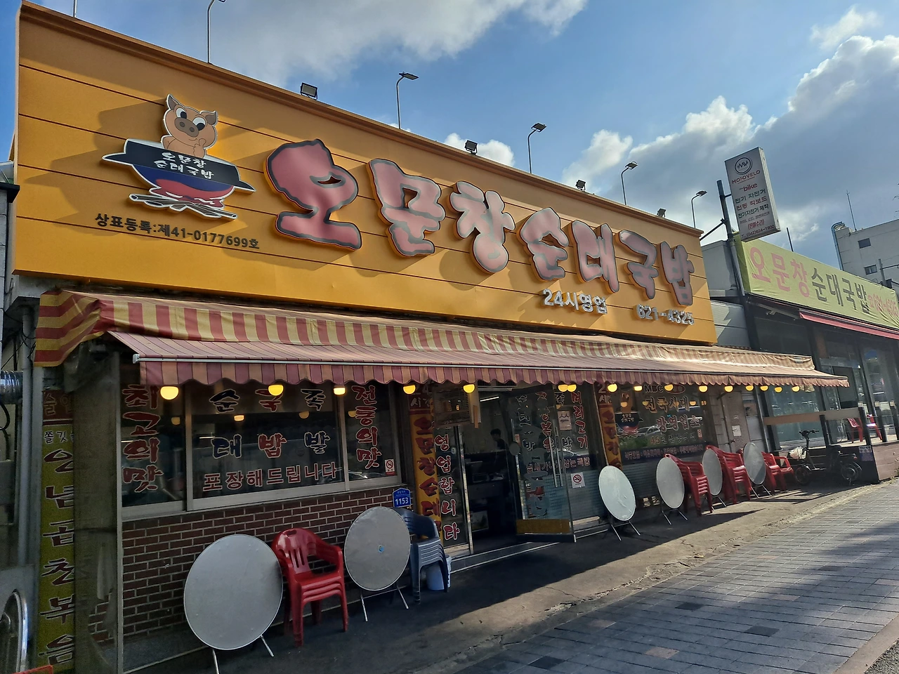 식당 앞 유리창에 ‘최고의맛’과 ‘전통의맛’ 빨간 글자 사이로 ‘순대’, ‘국밥’, ‘족발’ 글자가 큼직하게 쓰여 있다. ‘냄새가나지않는국밥’, ‘45년전통의집’, ‘24시간’ 글자도 눈에 띈다. 중소벤처기업부 인증 백년가게 엠블럼도 붙어있다.