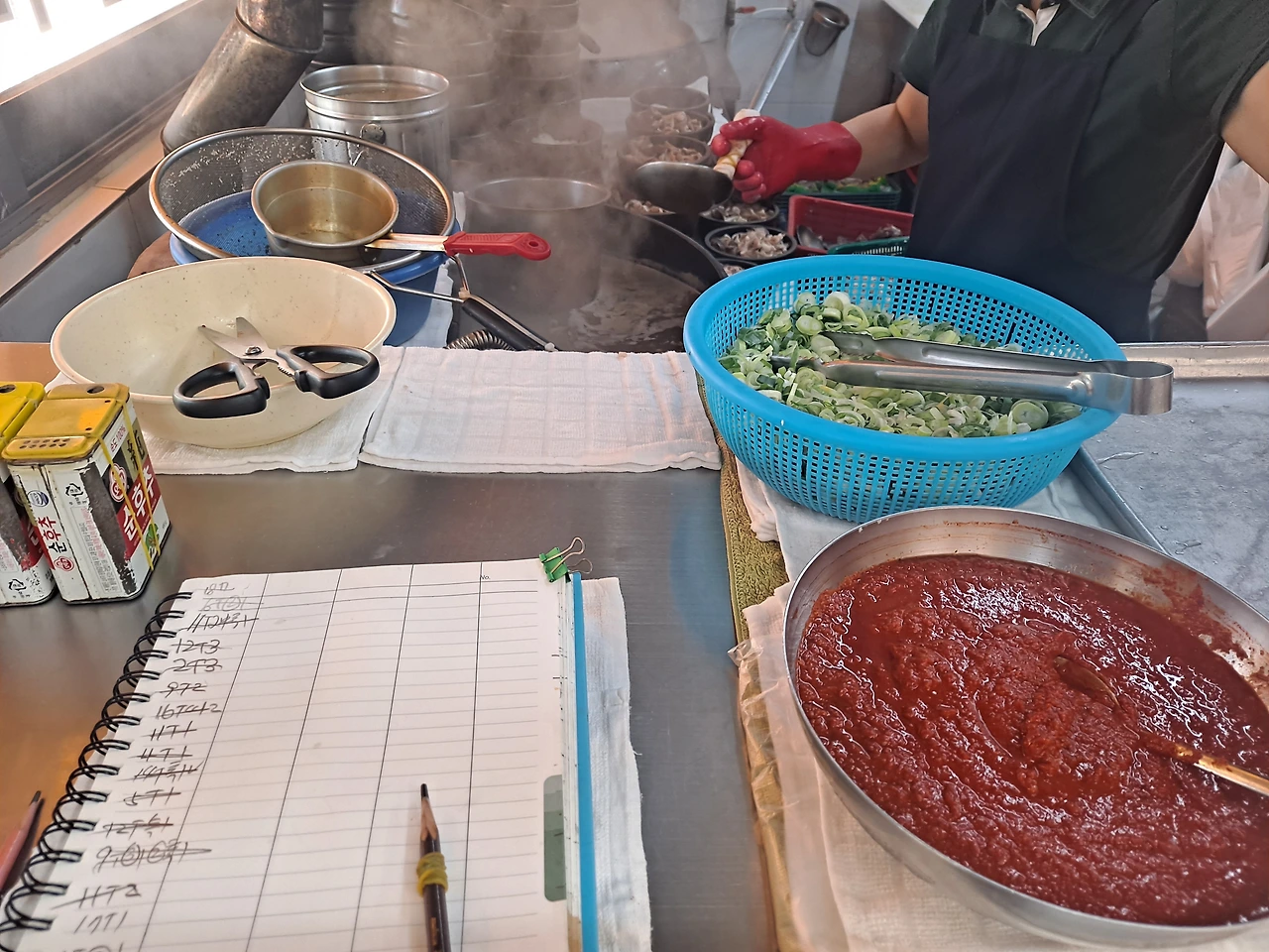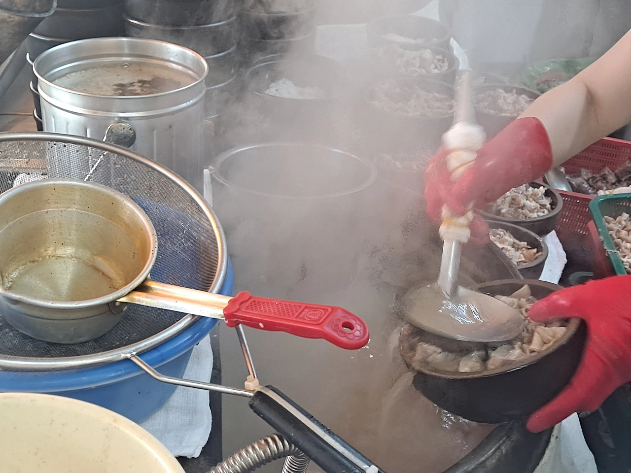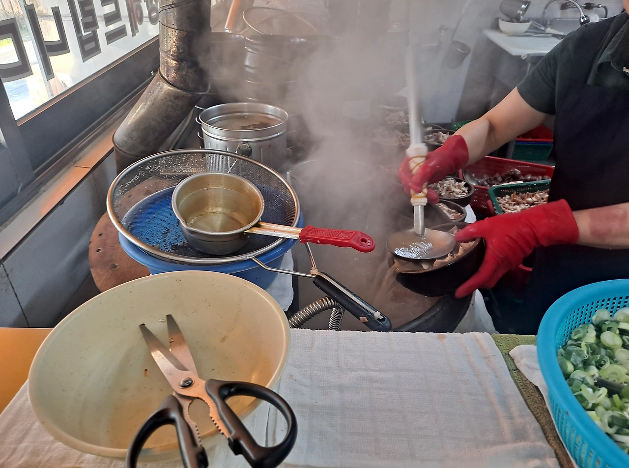 수증기가 모락모락 오르는 솥에는 갈색 국물이 펄펄 끓고 있다. 이모님 한 분이 빨간 위생 장갑을 끼고 뚝배기에 국물을 부었다 따랐다 반복한다. 토렴질이다.