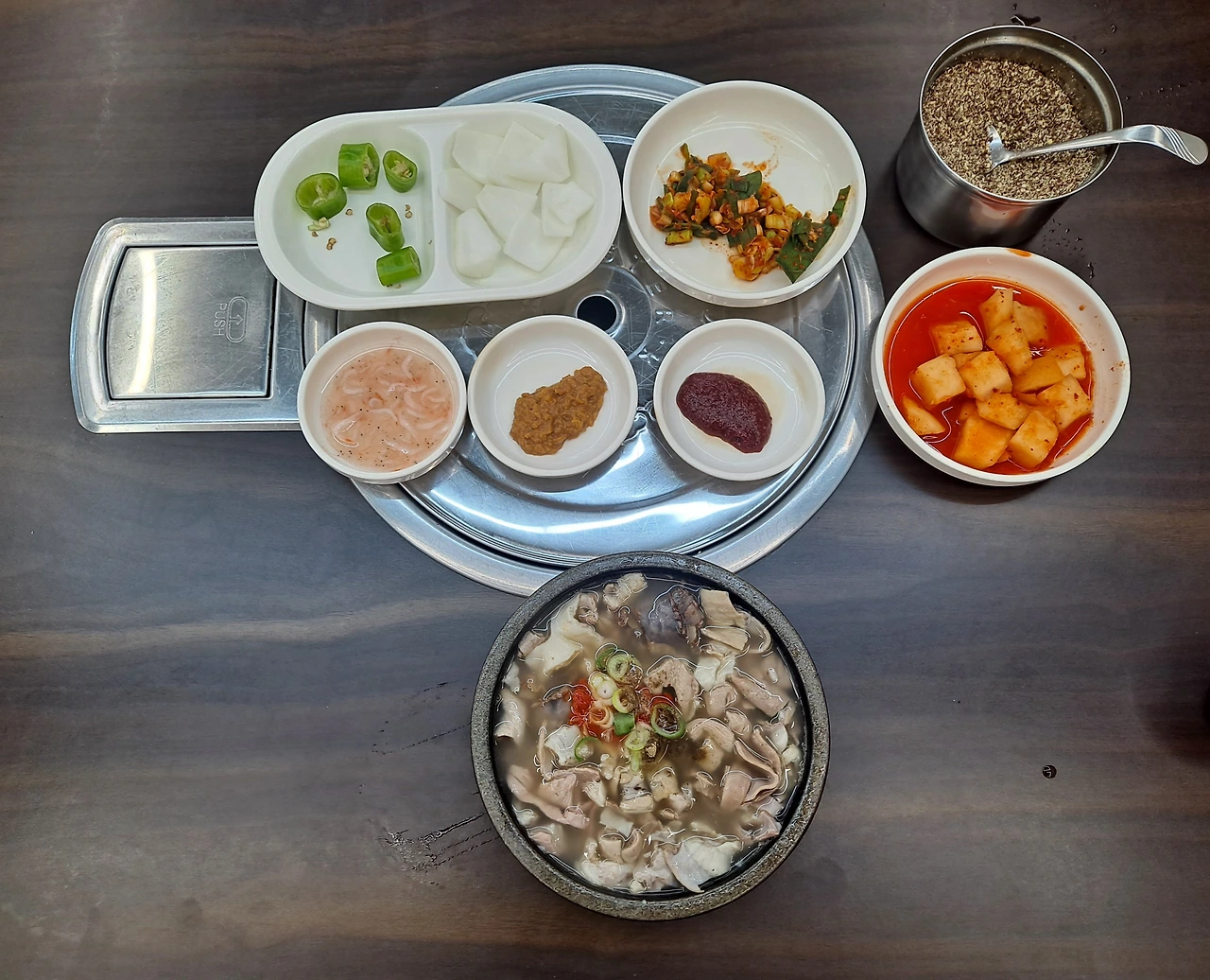 고추, 양파, 새우젓, 들깻가루, 된장, 고추장, 깍두기, '파다대기' 또는 '파대기'라 부르는 시그니처 밑반찬인 파 양념무침 등이 식탁에 차려진다.