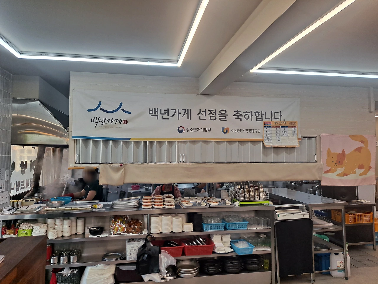 식당을 살펴본다. 열린 주방 위에는 백년가게 선정을 축하하는 플래카드가 붙어 있다. 주방 뒤 넓은 공간에는 종업원분들이 식재료를 다듬고 포장용 밑반찬을 담느라 바쁘다.