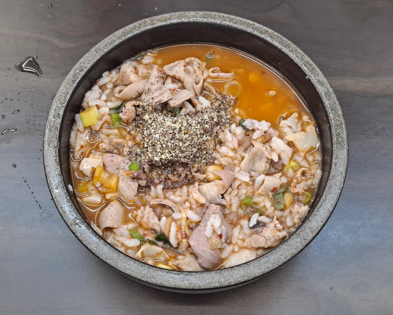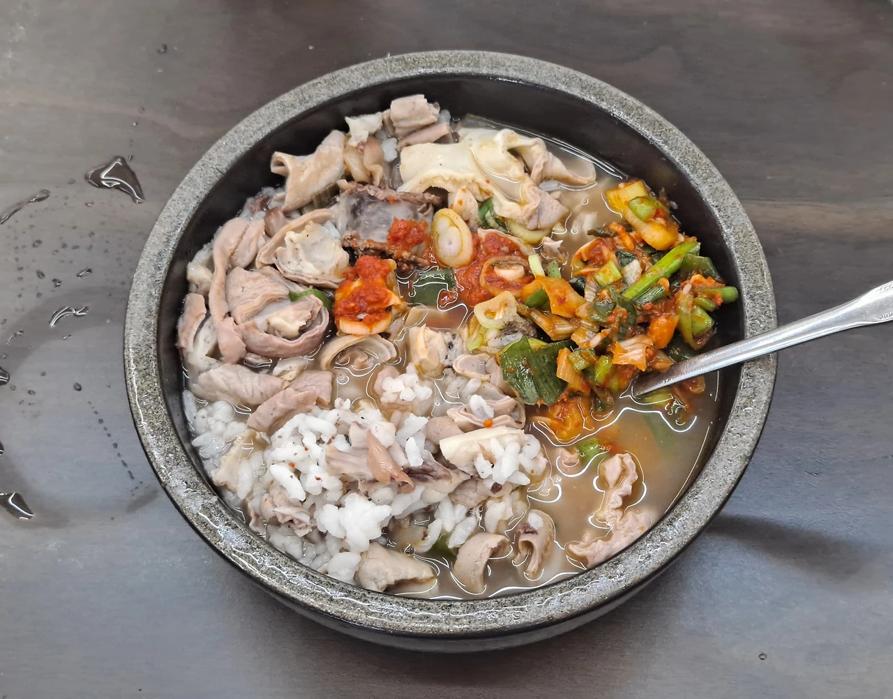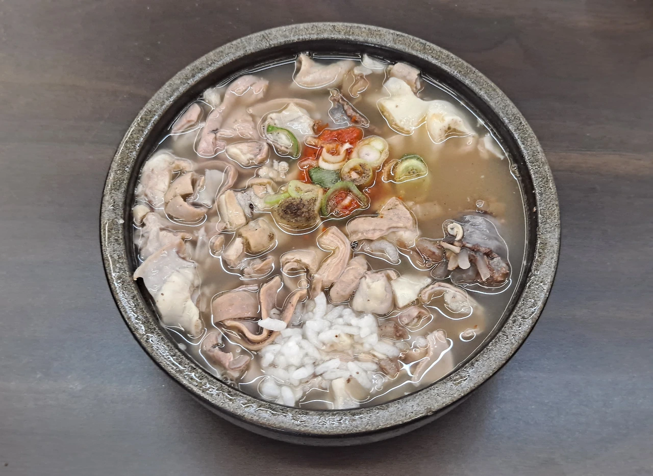 흙빛 뚝배기에 국물이 가랑가랑하다. 뚝배기는 토렴한 밥, 돼지 내장과 순대로 꽉 차 있다. 빈틈이 없다.