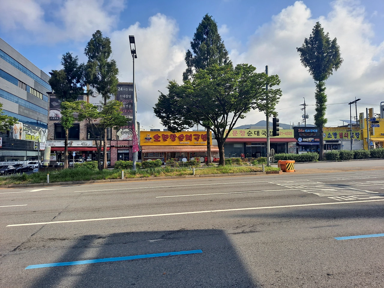 파란불을 보며 횡단보도를 건넌다. '오문창순대국밥' 상호가 붙은 건물이 두 개 다. 빨간색 상호 우측 건물은 식당 확장을 위해 내부 공사 중이다.