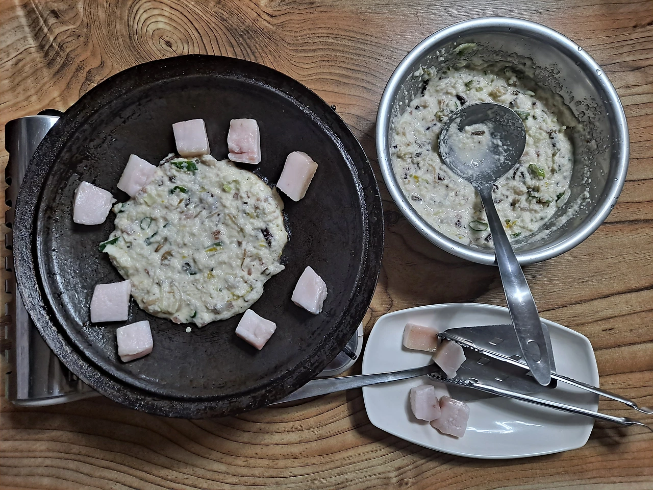 달구어진 솥뚜껑 끝부분에 돼지비계를 올려 기름이 흘러나오게 한다. 녹두 반죽을 한 국자 떠서 되직하게 올린다. 집게로 돼지비계를 꼬집듯이 비튼다. 돼지기름이 졸졸 흐른다.