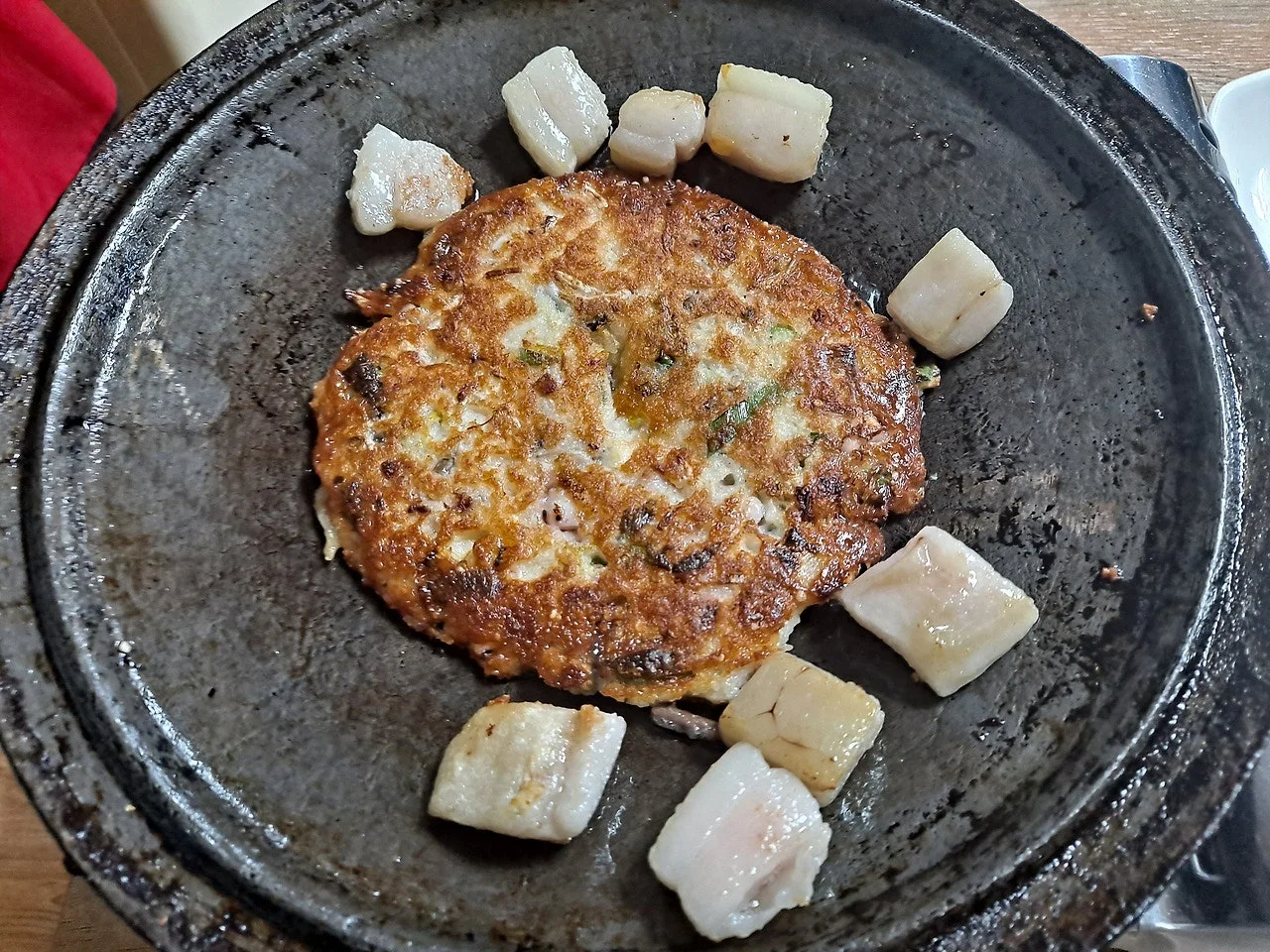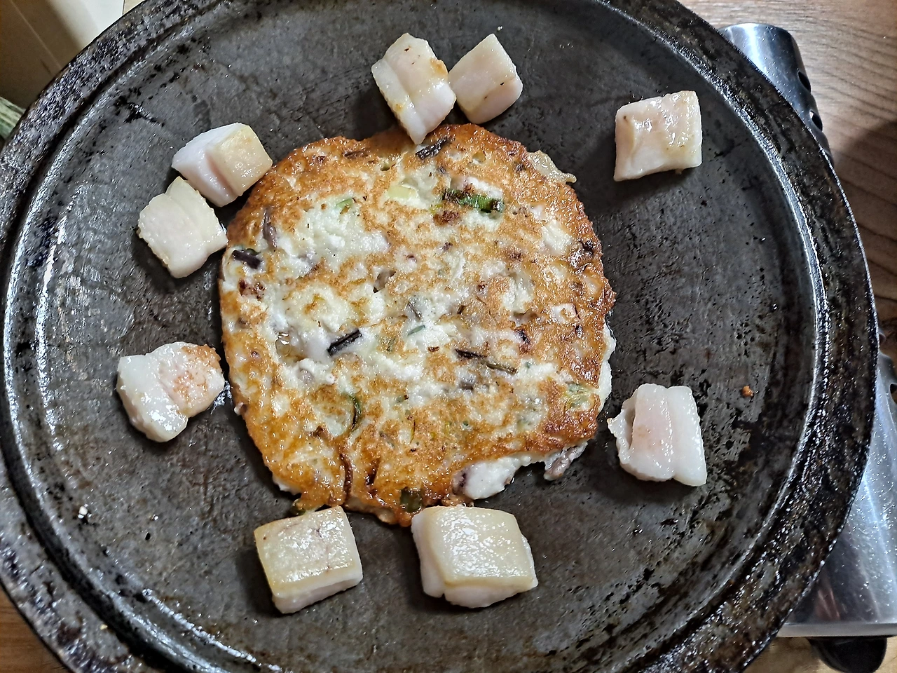한쪽 면이 노릇하게 잘 익으면 집게와 뒤집개로 살며시 뒤집어 반대쪽도 노릇하게 지진다. 셀프로 부치는 수고스러움이 있지만 굽는 재미가 제법 쏠쏠하다. 더불어 굽기 정도도 취향에 맞게 할 수 있다.