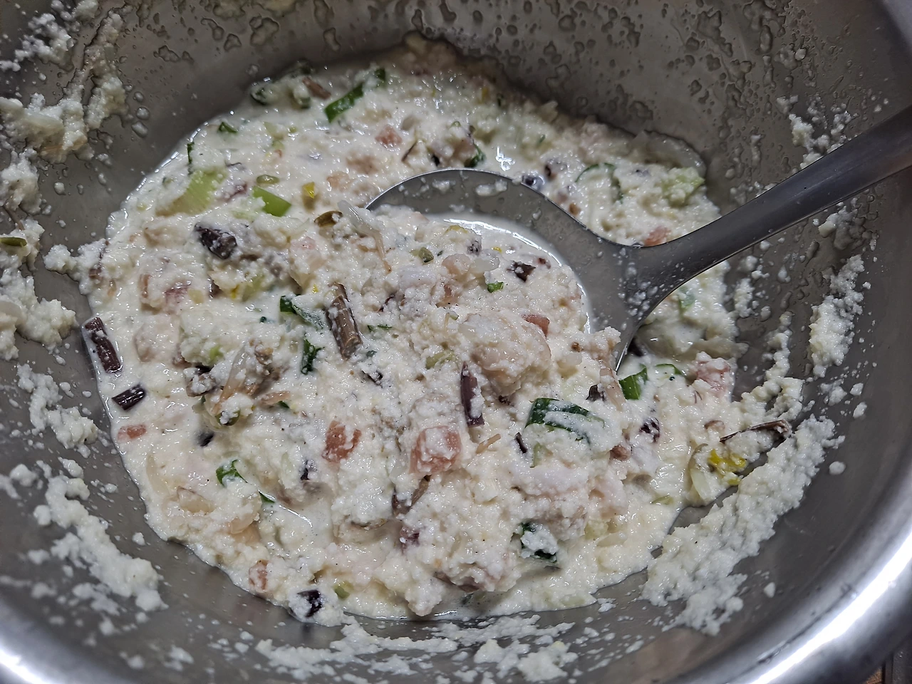 빈대떡 반죽은 물에 불려 간 녹두에 고사리, 파, 숙주, 돼지고기, 오징어 등을 잘게 썰어 넣고 삼삼하게 간한 반죽을 큰 양푼에 담아 내준다. 걸쭉하고 하얀 녹두 반죽 사이로 알록달록 신선해 보이는 재료들이 박혀 있다.