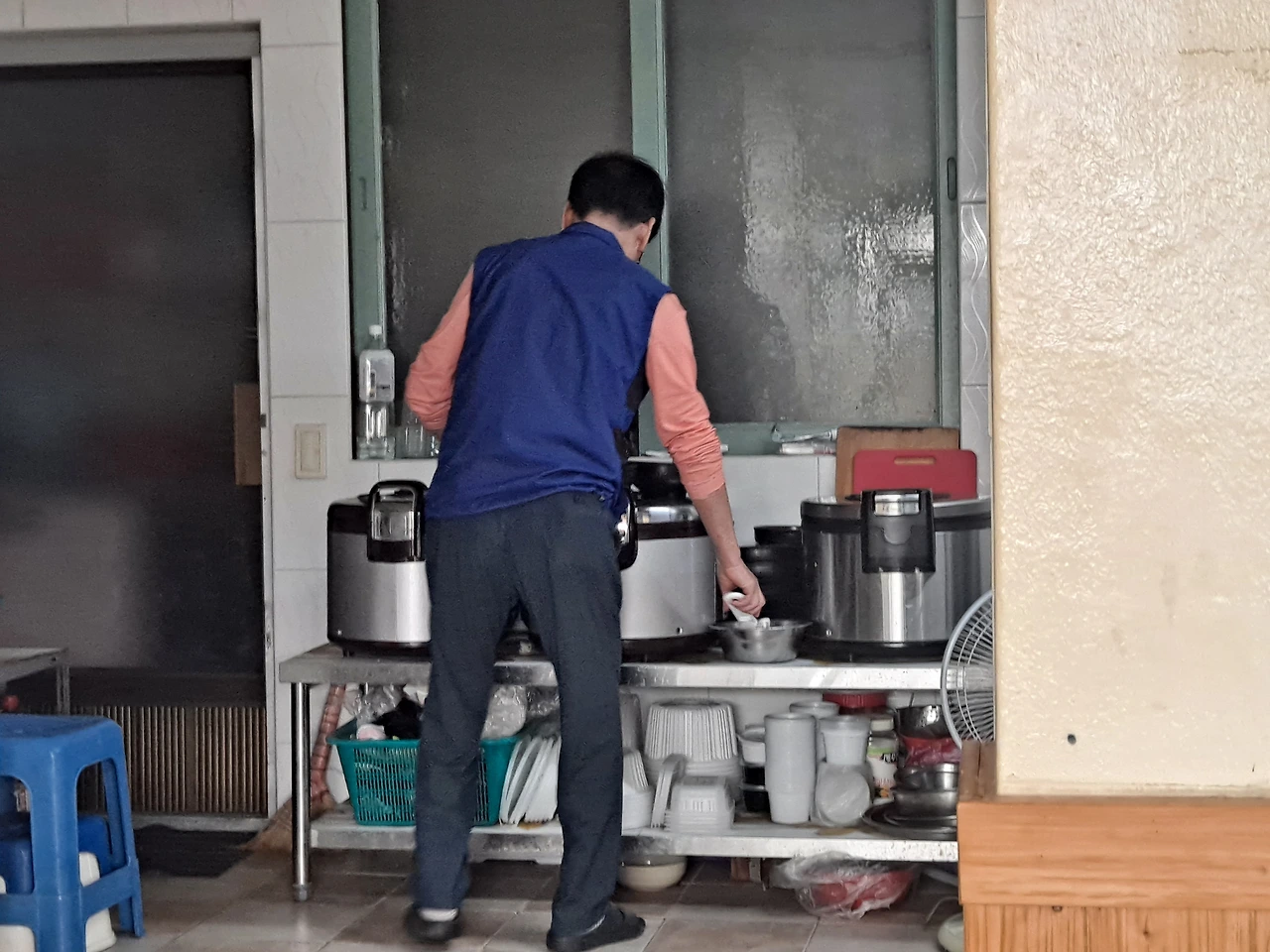 남 사장님이 배식구 좌측 열린 주방으로 들어가며 여사장님께 “국밥 3개요” 하며 주문 내용을 전달한다.