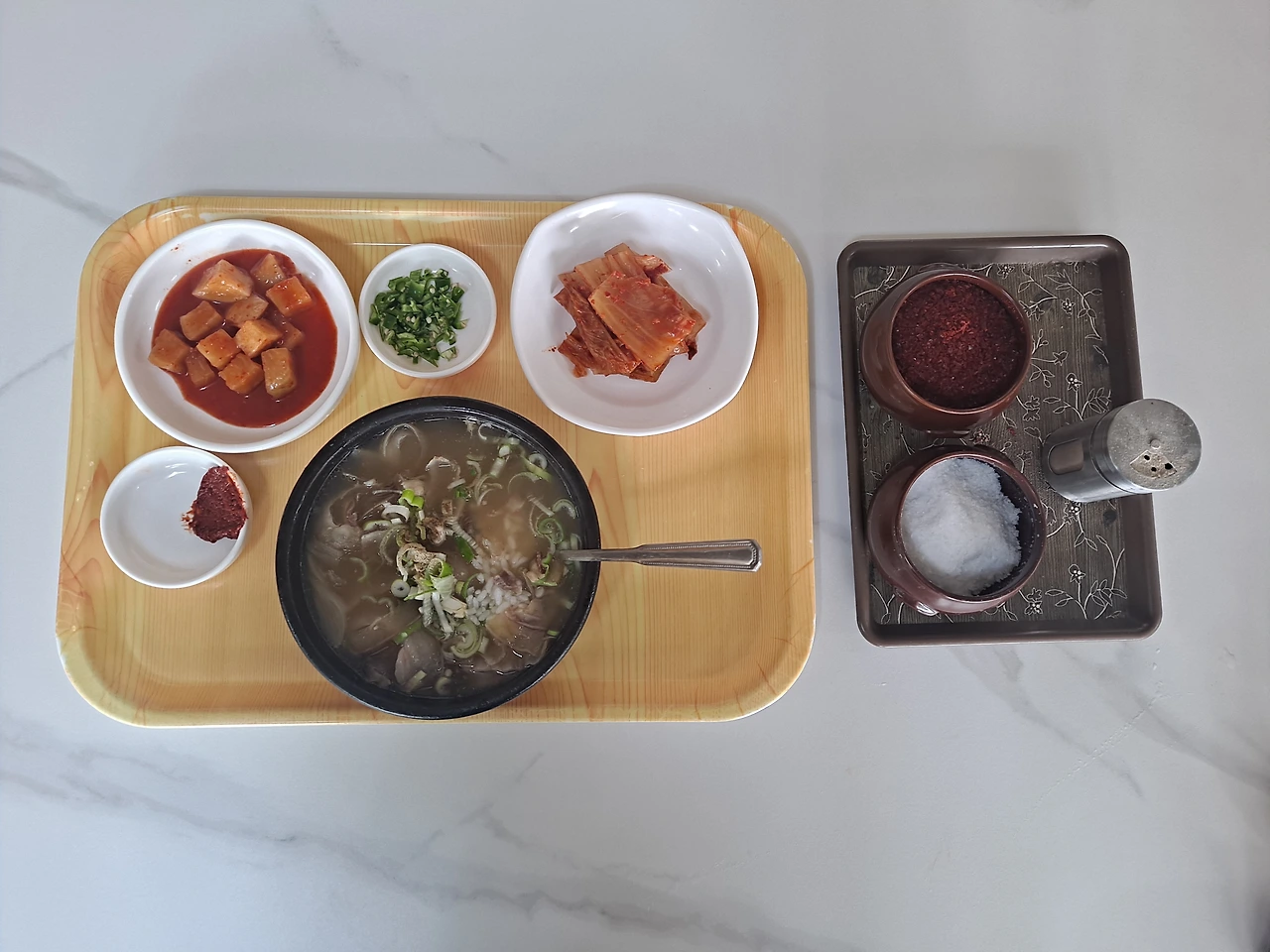 토렴 과정을 보고 자리로 돌아와 앉는다. 잠시 후 남 사장님이 소머리국밥과 깍두기, 묵은김치, 청양고추, 다진양념 등 밑반찬을 작은 쟁반에 담아 내준다. 식탁에는 고춧가루, 소금, 후추가 놓여 있어 취향에 맞게 추가할 수 있다.