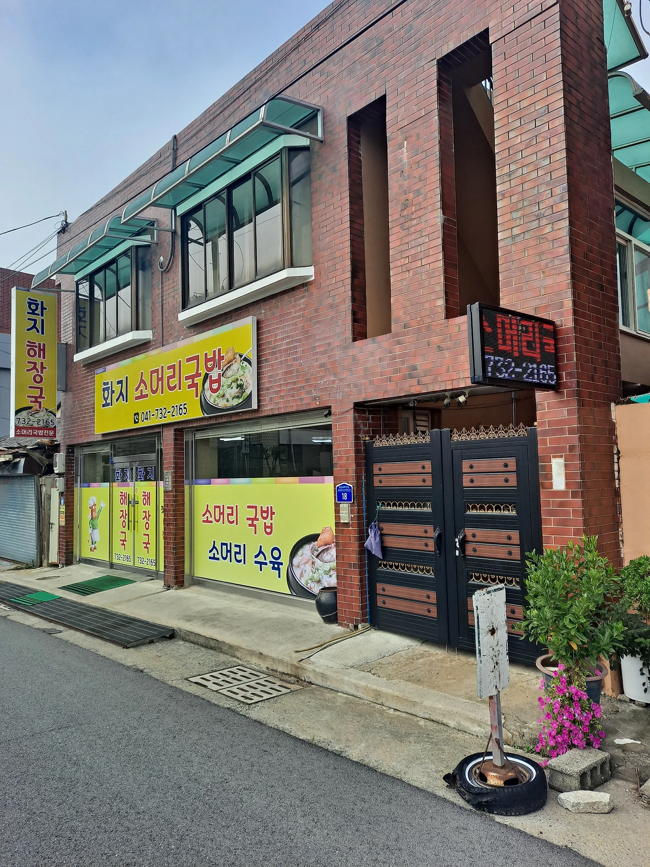 10시 27분 2층 빨간 벽돌 건물 앞에 다다른다. 도드라진 노란 간판에 ‘화지해장국’ ‘화지소머리국밥’ ‘해장국’ ‘소머리국밥’ ‘소머리수육’ 글씨가 큼직하게 쓰여 있다.