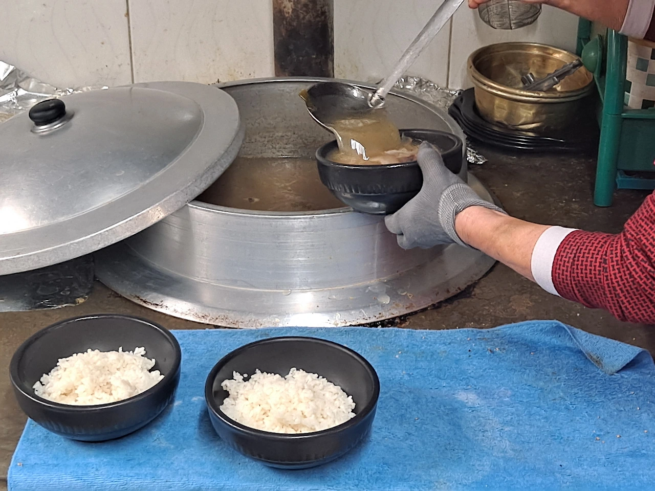 밥이 담긴 뚝배기는 육수가 끓고 있는 솥 앞에 놓인다. 양은솥 안에서는 황톳빛 국물이 뭉근히 끓고 있다.