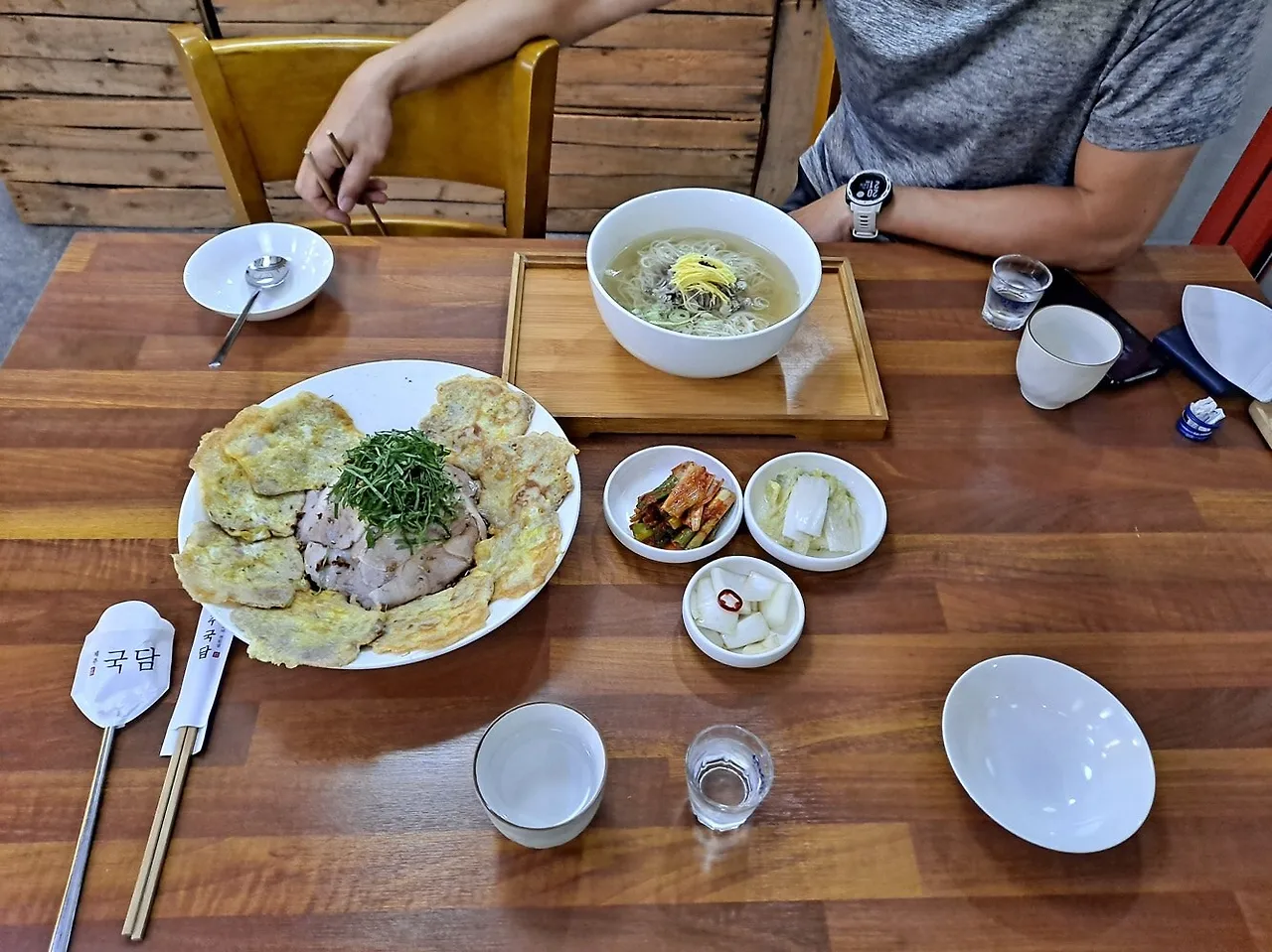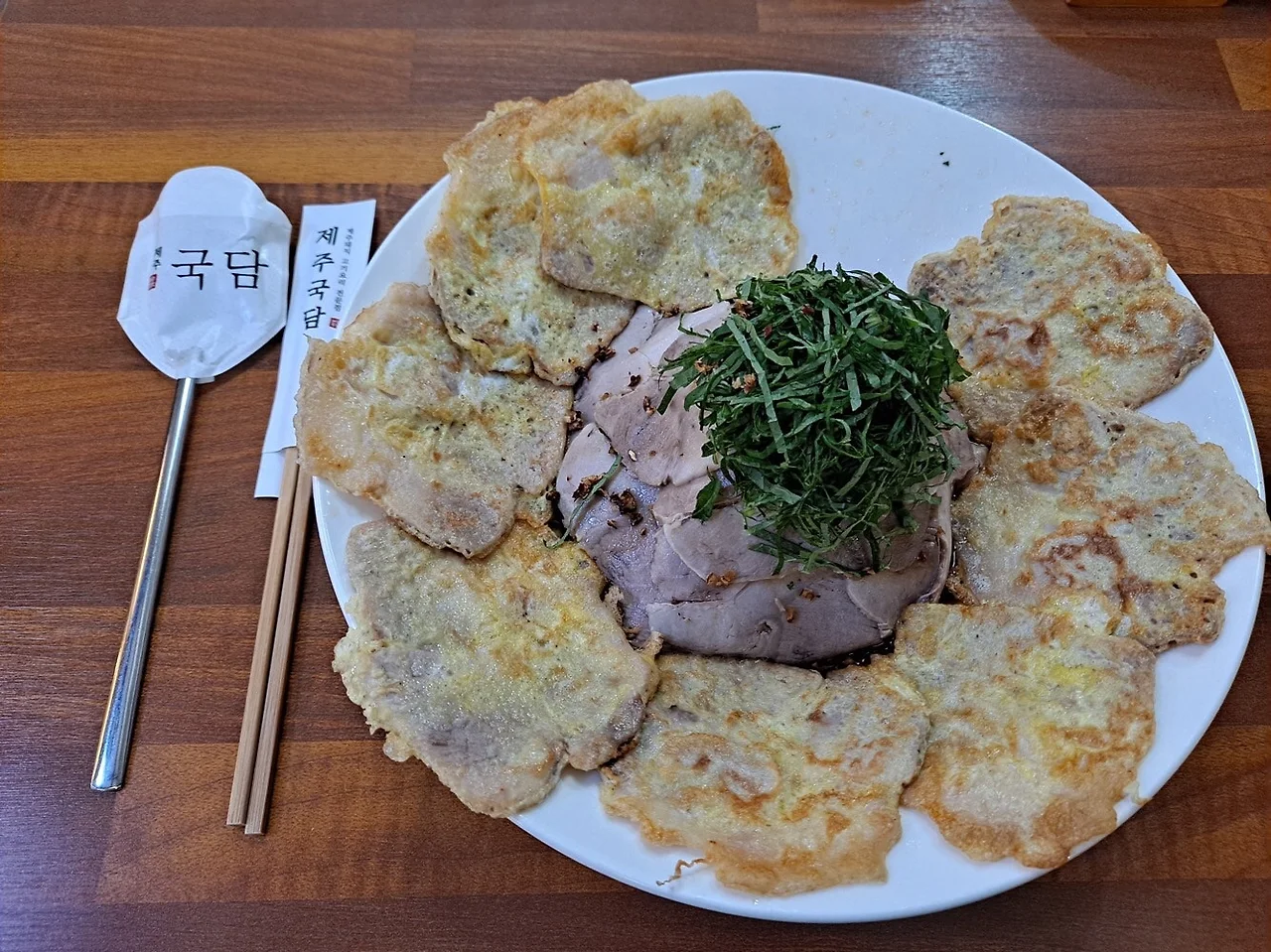 국담세트와 고기국수를 주문한다. 국담세트는 하얀 접시에 제주산 돼지고기 수육을 산 모양처럼 겹겹이 쌓아 채 썬 깻잎을 얹은 백육을 중앙에 담고 주변으로 돼지고기 육전을 빙 둘러 가지런하게 담았다.