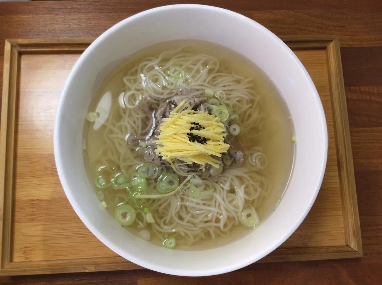 제주 돼지고기로 우려낸 맑고 깔끔한 국물에 생면을 담고 송송 썬 파, 돼지고기, 노란 달걀지단, 검은깨 등을 고명으로 얹어 내온다.