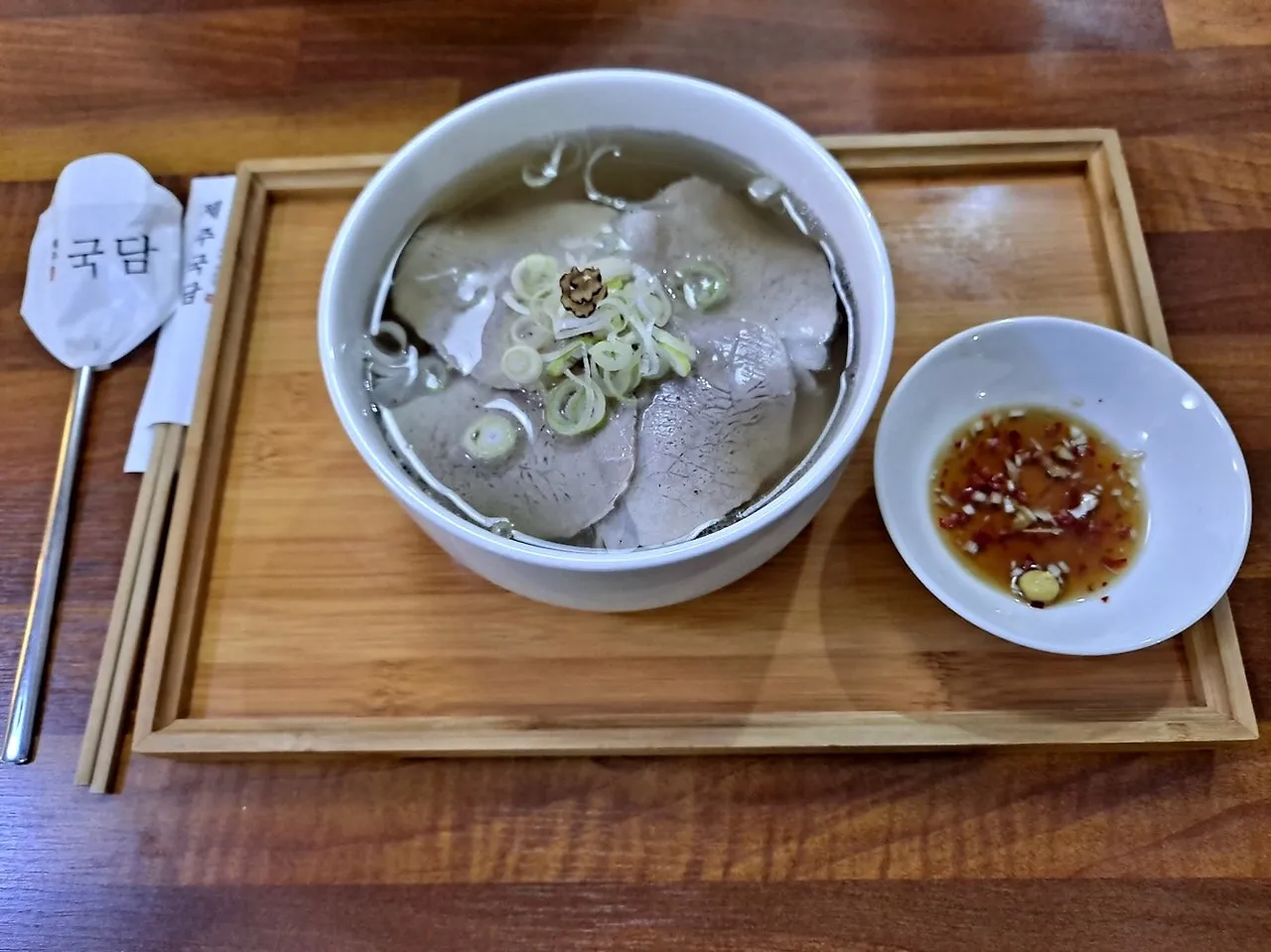 국물만 맛본다. 삼삼하다. 짜게 먹지 않으면 적당한 간이다. 부드러운 식감의 돼지고기 살코기는 파, 고춧가루, 겨자 등을 넣은 새곰한 양념장에 찍어 먹어도 좋다.
