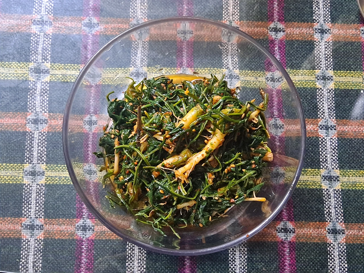텃밭에서 깬 씀바귀에 갖은 양념하여 무쳤다. 진한 풍미의 깨와 참기름, 고춧가루 등이 씀바귀 고유의 쓴맛을 여리게 가리지만 덮진 못한다.