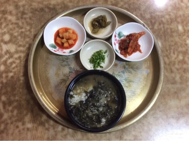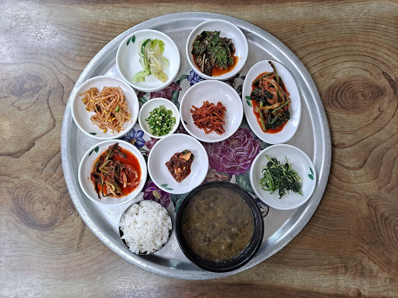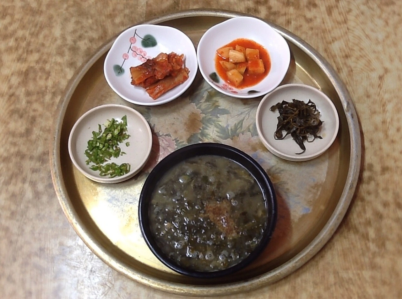 쑥된장국을 주문한다. 뚝배기에 밥을 담고 미리 끓여둔 쑥국을 넣어 한소끔 데운 쑥된장국과 군내 없는 시큼하고 아삭한 묵은 김치, 깍두기, 고춧잎 절임, 고추지등 소박한 밑반찬이 꽃그림이 그려진 빛바랜 양은 쟁반에 차려진다.