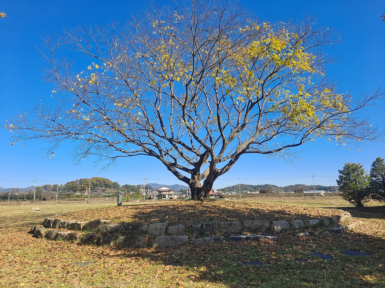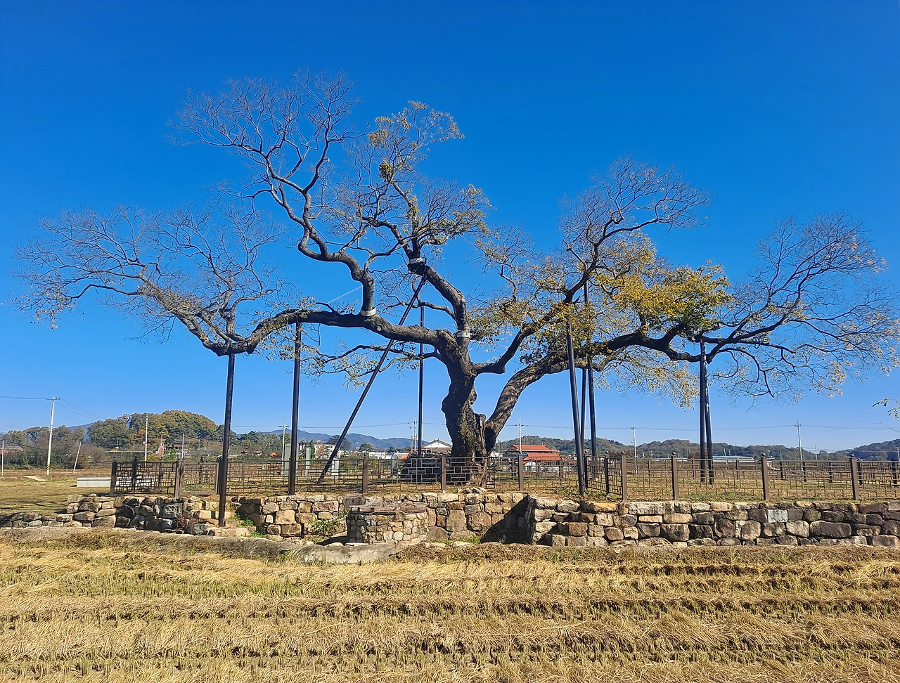 석축 위로 천연기념물 예천 금남리 황목근과 후계목 황만수가 노란 잎을 매달고 가을을 나고 있다.