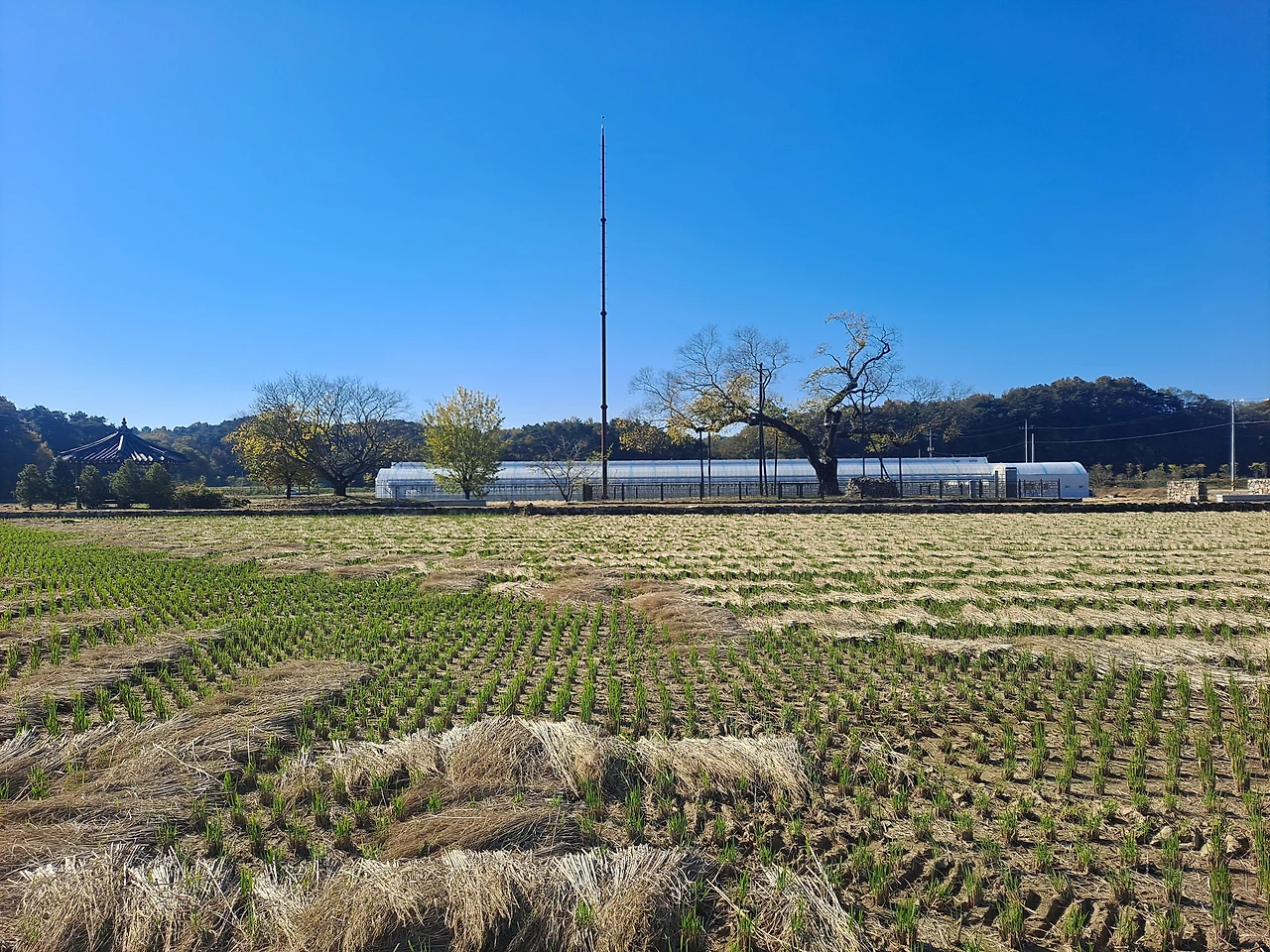 추수한 논에는 누런 볏단이 가지런히 쌓여 있고 벼 밑동에선 푸른 새싹이 자란다.