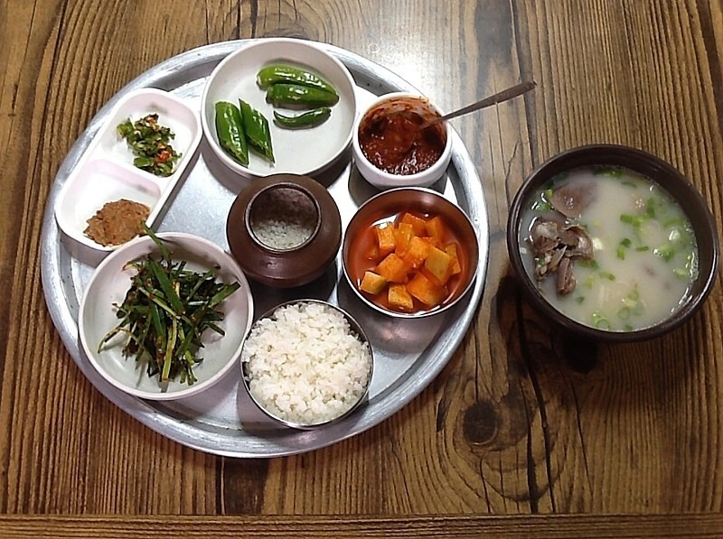 준비해 둔 뚝배기에 송송 썬 푸른 파를 얹어 내준다. 밥은 토렴하지 않고 따로 내준다. 된장, 다진 고추, 매운 청양고추와 맵지 않은 고추, 다진양념, 볶은 소금, 부추무침, 자작한 국물의 깍두기 등 밑반찬도 둥그런 양은 쟁반에 담아 함께 나온다.