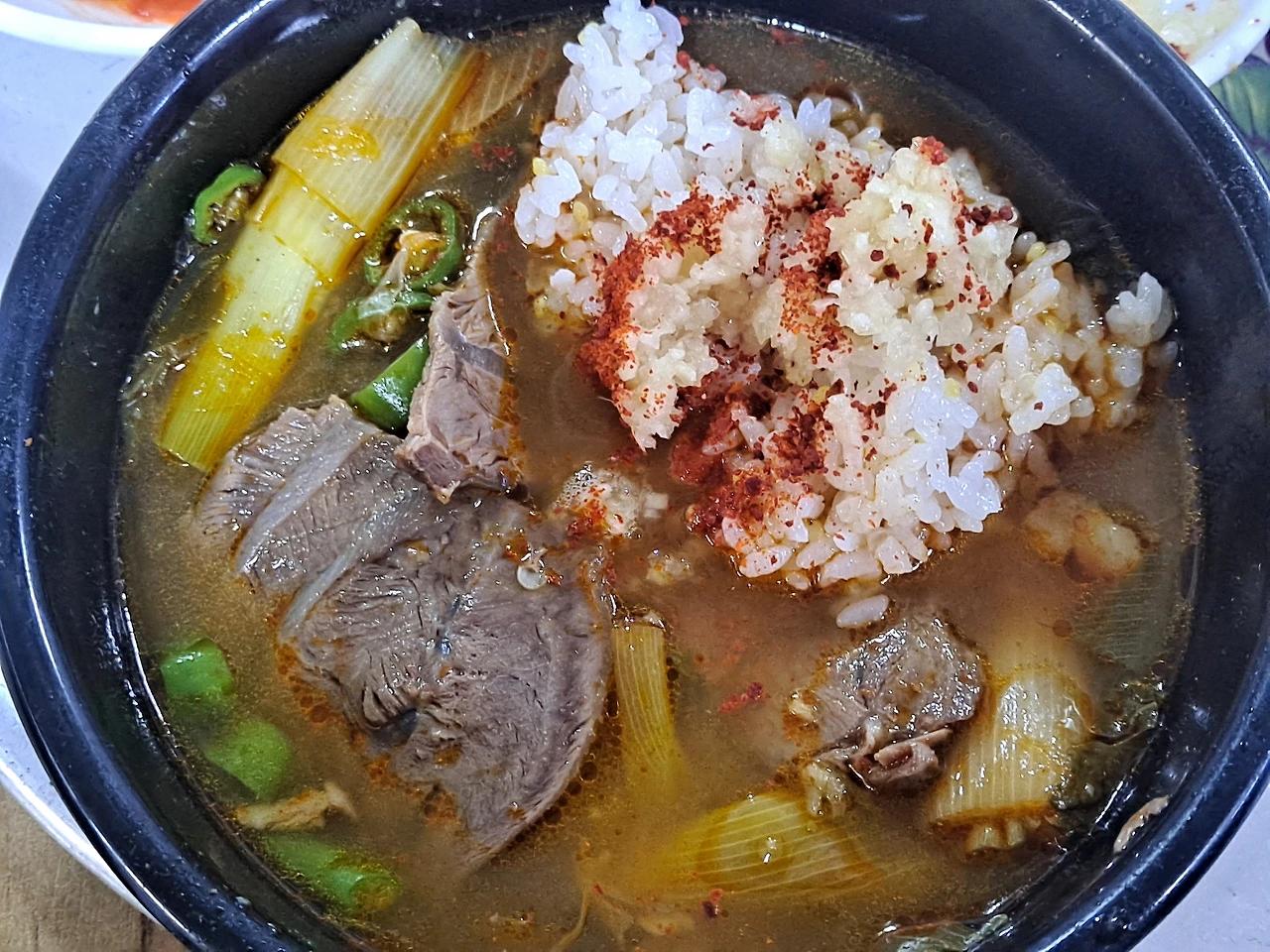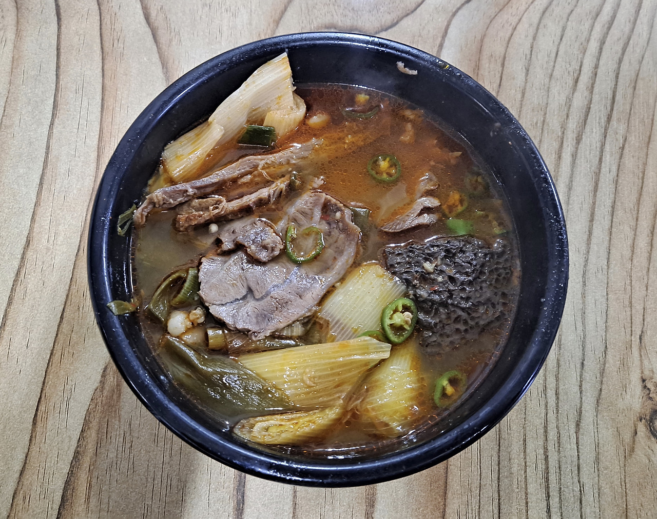 검은색 바탕 안으로 기름 동동 뜬 국물의 붉은 기운이 또렷하다. 푸름과 하얌이 수그러든 대파, 형태가 다른 진갈색 소고기, 검붉은 선지 등 건더기들이 큼지막하게 빨간 국물을 덮었다. 푸른 고추도 듬성듬성 보인다.