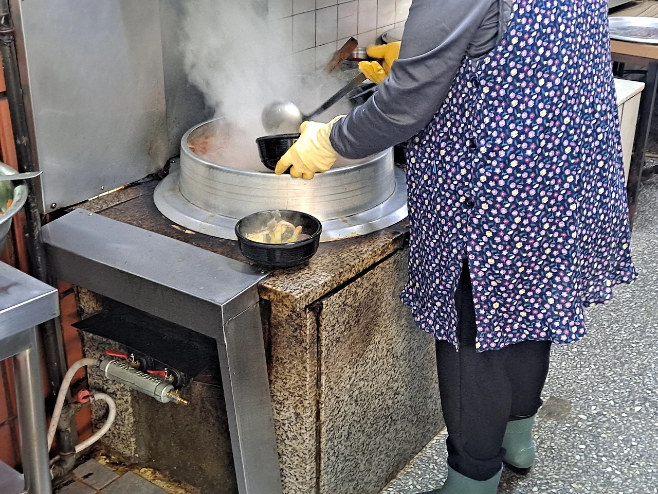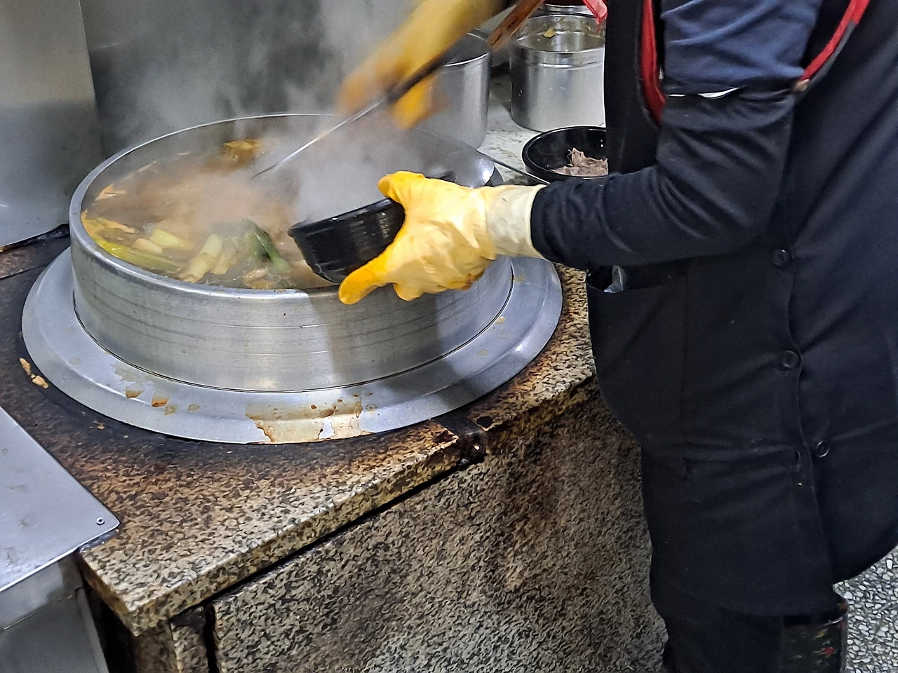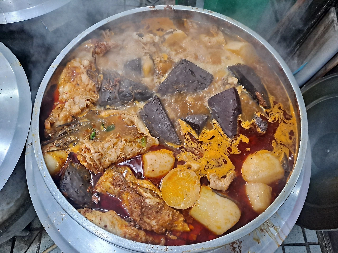 자세히 보기 위해 양은솥 앞 이모에게 걸어간다. 이모분은 뚝배기에 손질해 둔 갈비덧살, 양지 뱃살, 양지, 아롱사태 등을 깔고 대파, 배추 등 건더기를 넣은 후 선지를 올리고 커다란 솥에 팔팔 끓여낸 육수를 국자로 퍼 몇 차례 토렴한 후 국물을 퍼 뚝배기에 붓는다. 투박하고 푸짐한 선짓국밥이 완성된다.