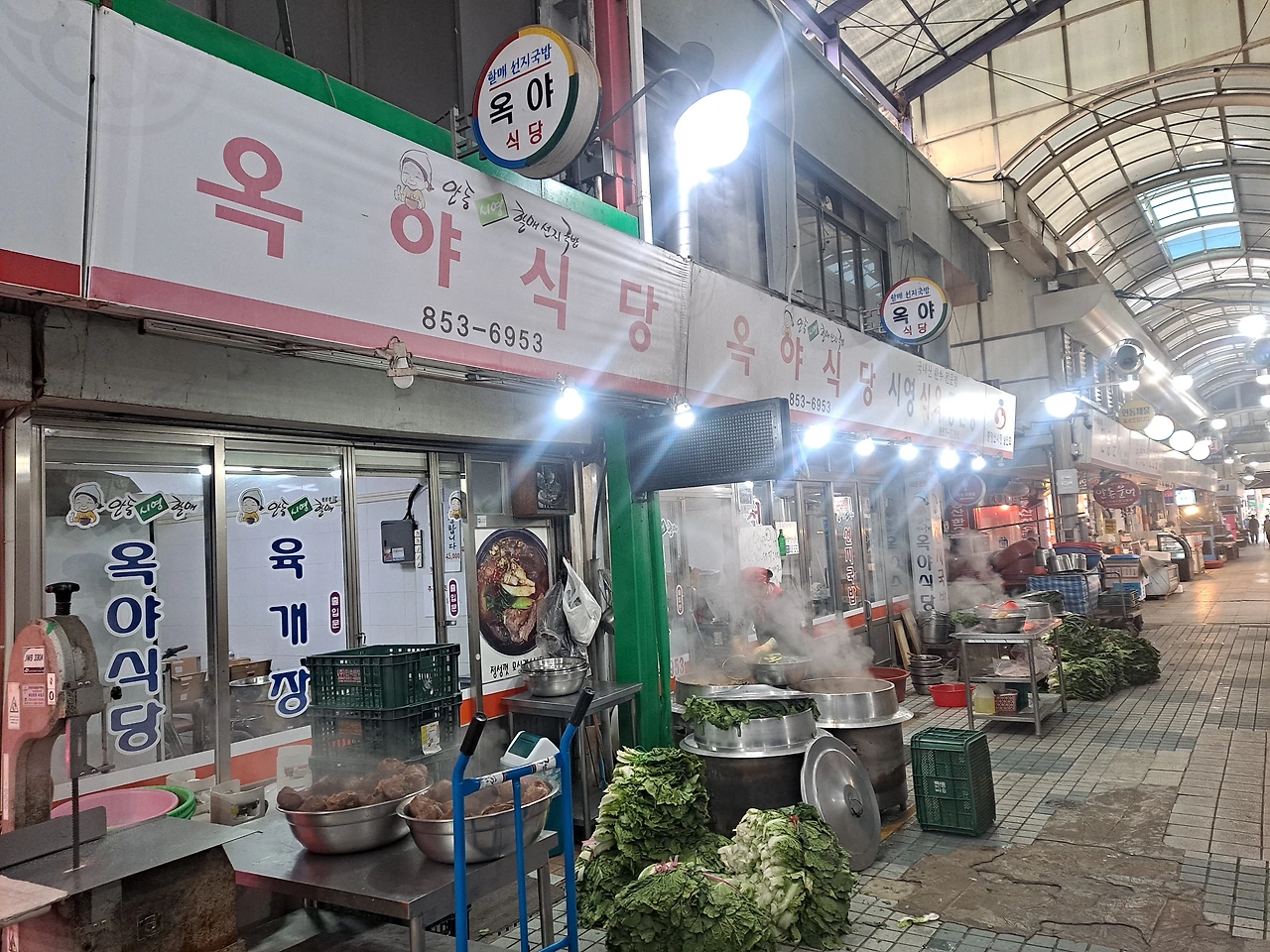 신시장 육교 양쪽 인도와 골목에 상인들이 빈틈없이 좌판을 깔았다. 장 보러 오시거나 구경하러 오신 분들로 길이 비좁다. 장 구경을 하고 8시 30분 옥야식당 영업 시작 시각에 맞춰 다시 찾는다.