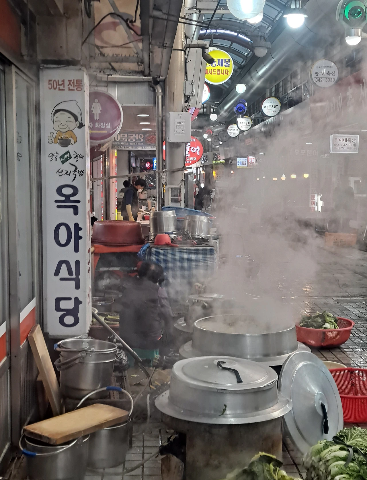 옥야식당은 오전 8시 30분에 영업 시작이다. 이모분들이 씻고, 데치고, 끓이고, 손질하느라 바쁘다. 영업 전 국밥 만드는 수고스러움을 살핀 후 장날 구경하러 시장 밖으로 나간다.