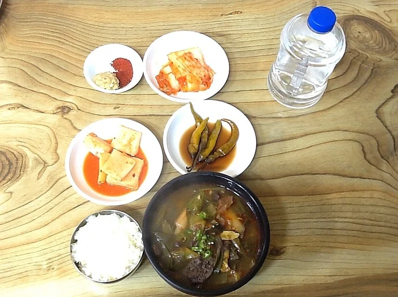 2016년 안동 여행 때 연세 많으신 창업주 할머님이 식당 한쪽에서 가위로 고기를 손질하는 모습이 인상적이었다. 코로나19 이후 할머님은 식당에 나오시지 않는다고 한다. 선짓국밥에 밥을 따로 내줬고 밑반찬으로 섞박지와 배추김치, 고추지가 함께 나왔다.