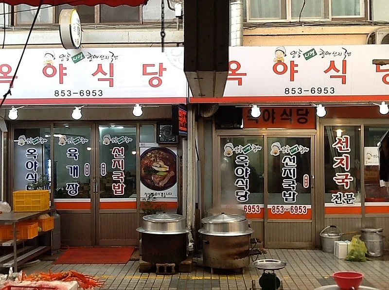 선지와 다양한 한우 부위를 푸짐하게 담은 선짓국밥이 대표 음식이다. 취향에 따라 선지를 뺄 수도 있다. 전국적으로 인지도가 높은 시장통 국밥집이다. 술은 팔지도 않고 마실 수도 없다.