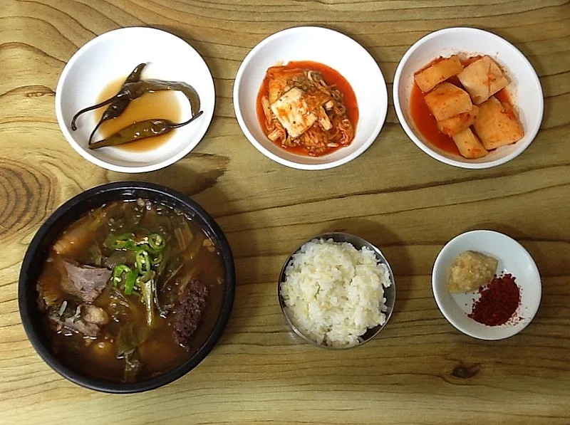 한우 살코기, 선지, 뼈 등으로 푹 우려낸 맑은 육수에 배춧잎, 대파, 무, 고추, 고춧가루 등을 넣고 끓여낸 균형 잘 맞은 국물이 얼근하고 산듯하다.
