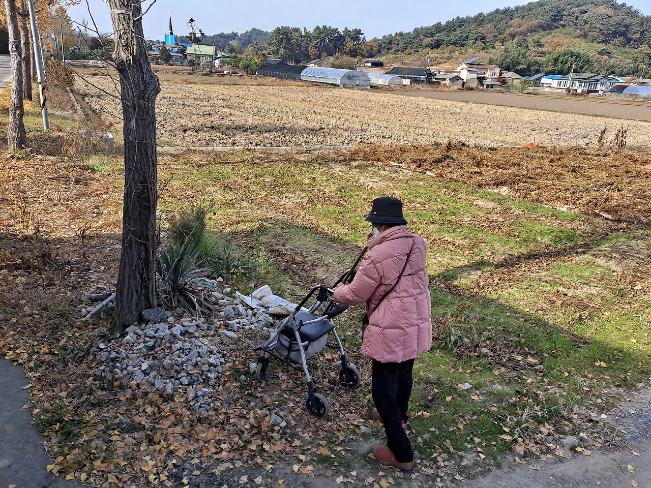 차안 지인분께 손을 흔드시고 나무 밑 손수레를 잡으신다.