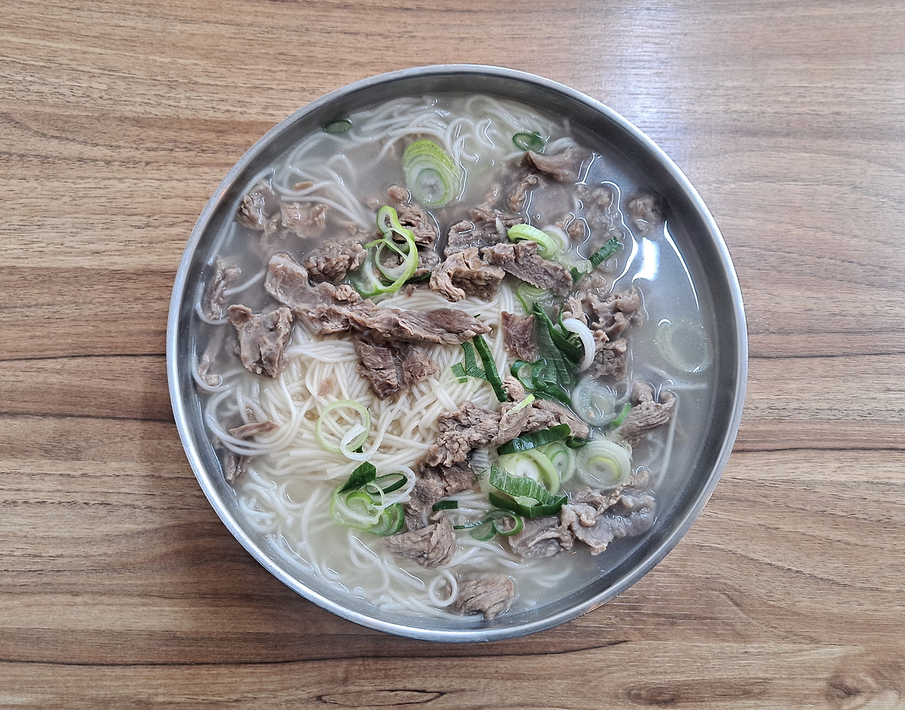 간간한 국물이 밴 국숫발의 알맞은 식감을 어금니는 눈치챈다. 어금니에 맞서지 않을 만큼의 찰기다. 찬물에 씻고 토렴한 수고스러운 손길이 만든 힘이다. 면에 묻힌 소고기 육수의 감칠맛이 그윽하다.