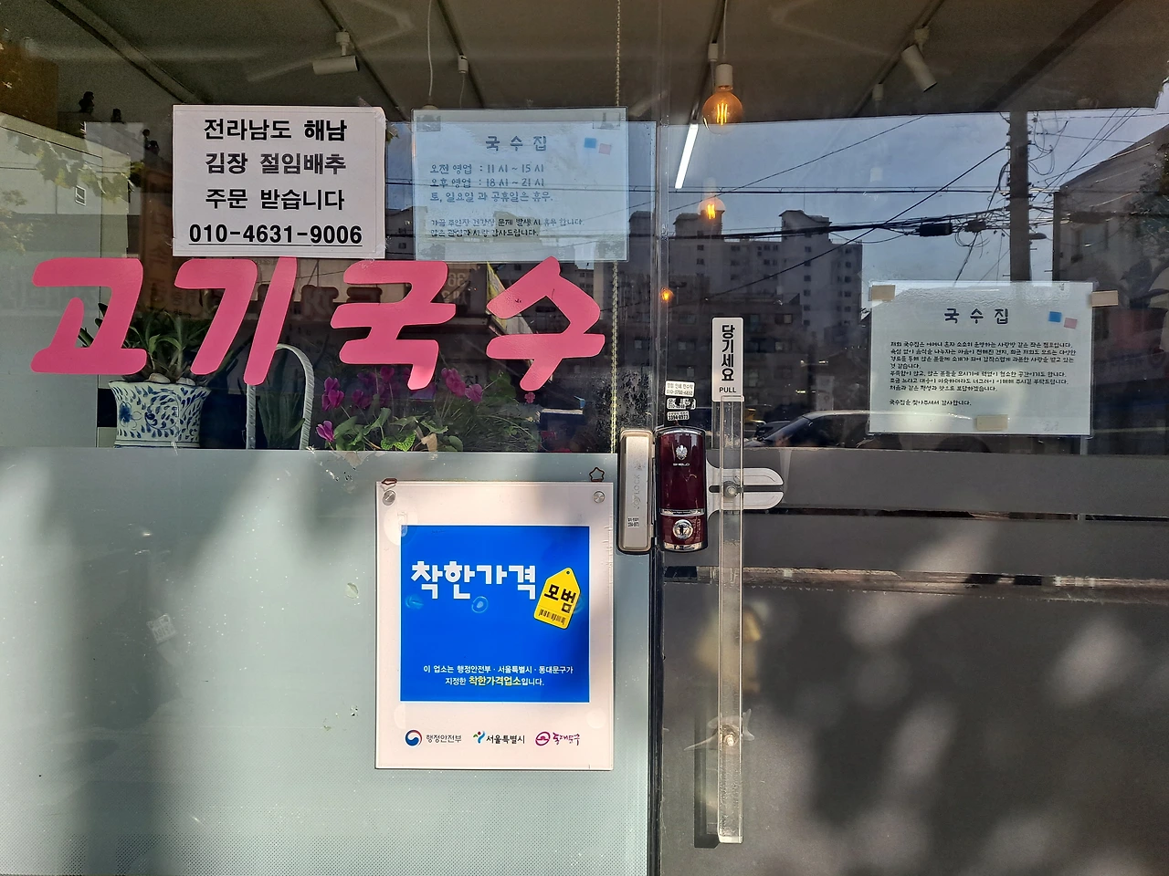 좀 더 가까이 다가간다. 식당 창에 착한가격 모범업소 엠블럼이 붙어 있다. 그 위로 분홍색으로 크게 쓴 ‘고기국수’가 눈에 띈다.