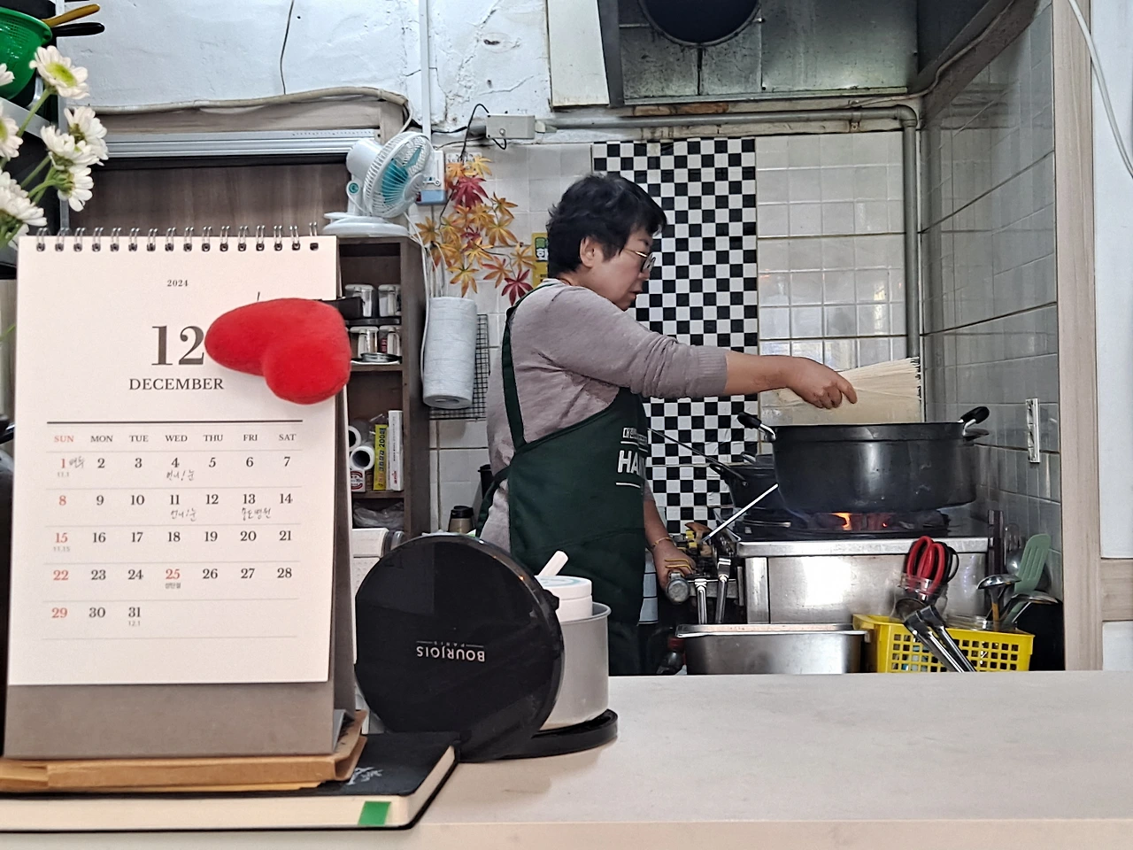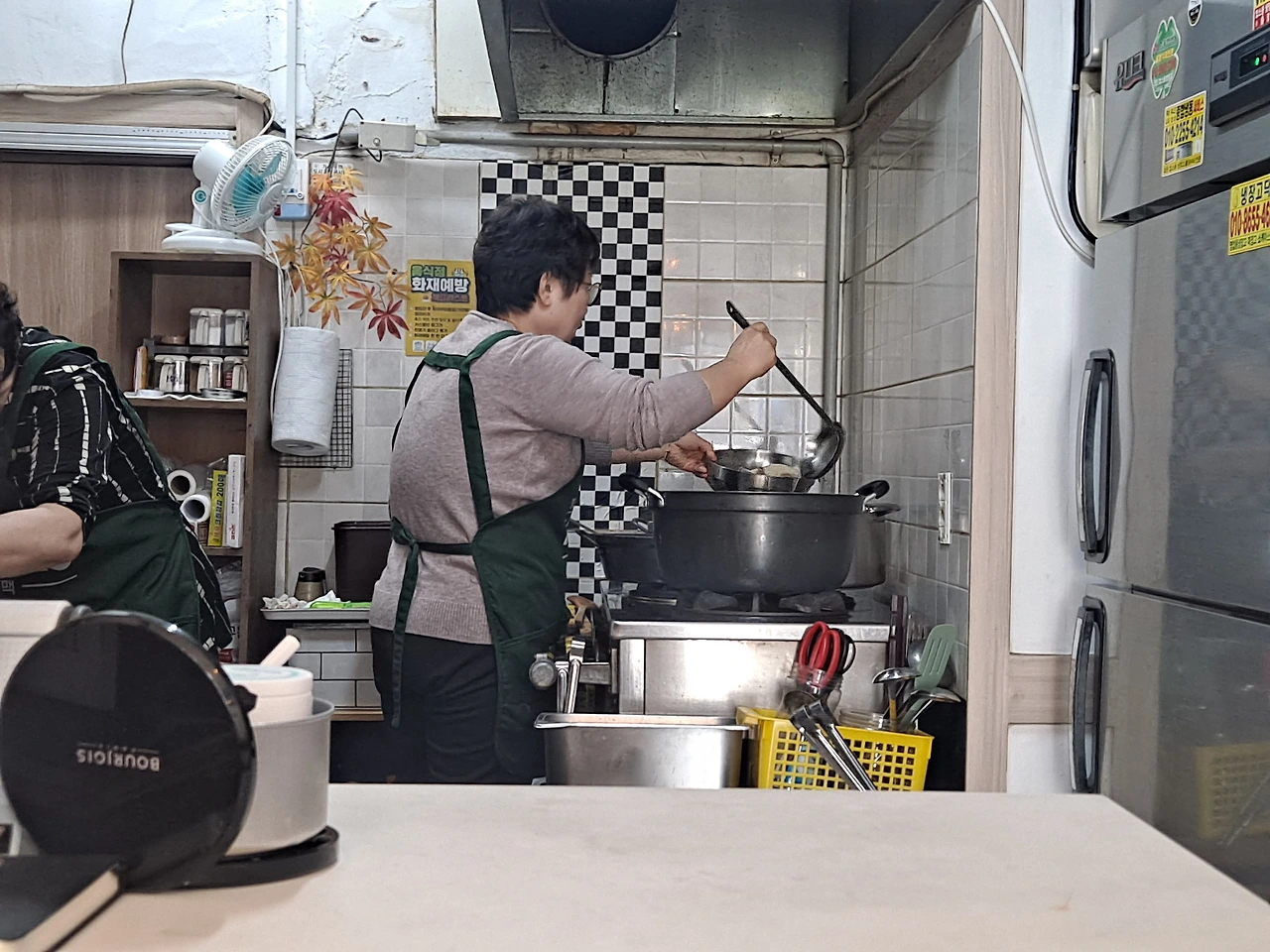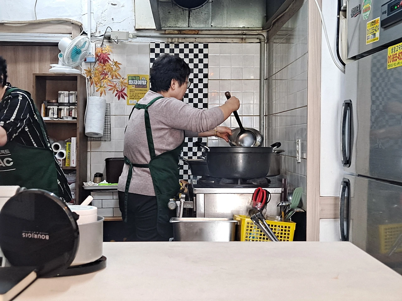 나이 지긋한 아주머니 한 분이 혼자인지 물어본다. 홀로 온 젊은 남자 손님에게 합석 가능한진 양해를 구하고 주방 앞 2인용 식탁으로 안내해 준다. 자리에 앉아 식당을 둘러본다.