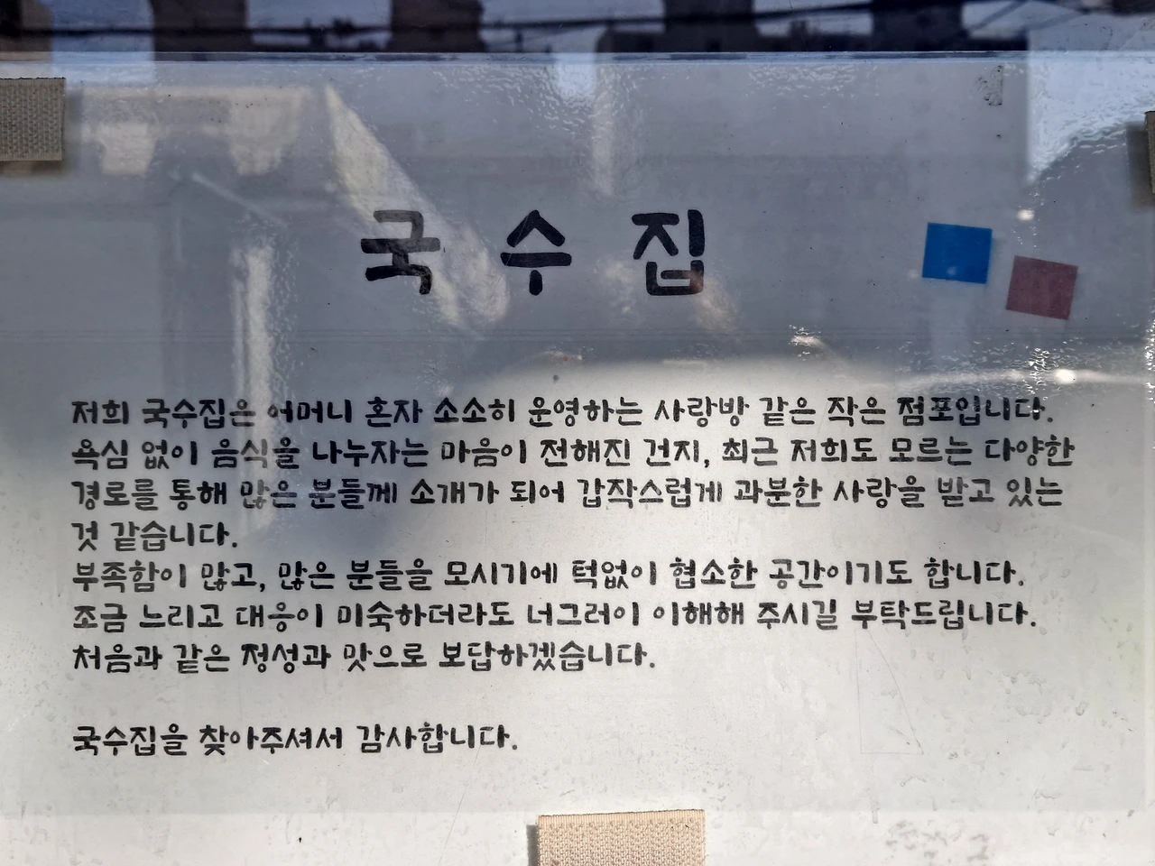 “저희 국수집은 어머니 혼자 소소히 운영하는 사랑방 같은 작은 점포입니다. 욕심 없이 음식을 나누자는 마음이 전해진 건지, 최근 저희도 모르는 다양한 경로를 통해 많은 분들께 소개가 되어 갑작스럽게 과분한 사랑을 받고 있는 것 같습니다.