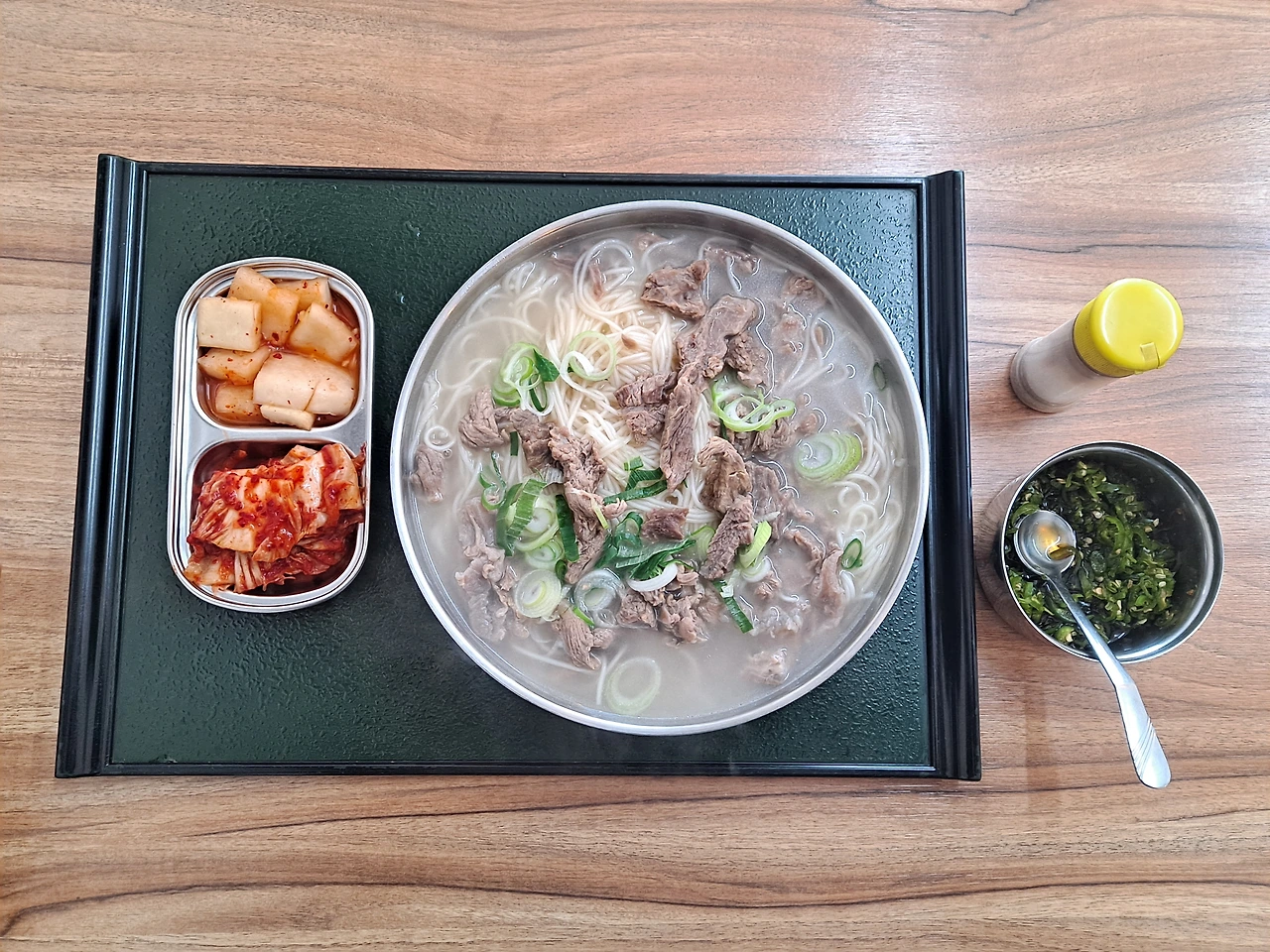 옆자리 부자분과 내 자리에 거의 동시에 고기국수가 놓인다. 국물을 먹으려는 순간 주문을 받았던 아주머니 분이 2인용 식탁 자리가 났다며 옮겨 드린다고 한다. 편하게 먹게 하려는 배려로 보인다.