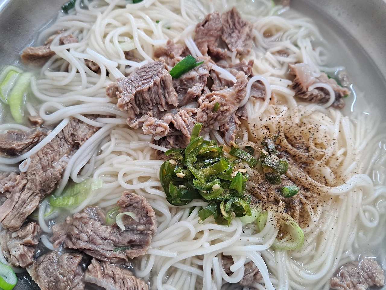 이 집 고기국수는 국물 색은 좀 더 여린 소고기 육수에 소고기를 올린 국수다. 푸짐하게 담긴 뽀얀 면 위로 갈색 소고기가 듬뿍 올려져 있고 푸른 썬 대파가 색감을 보탠다.