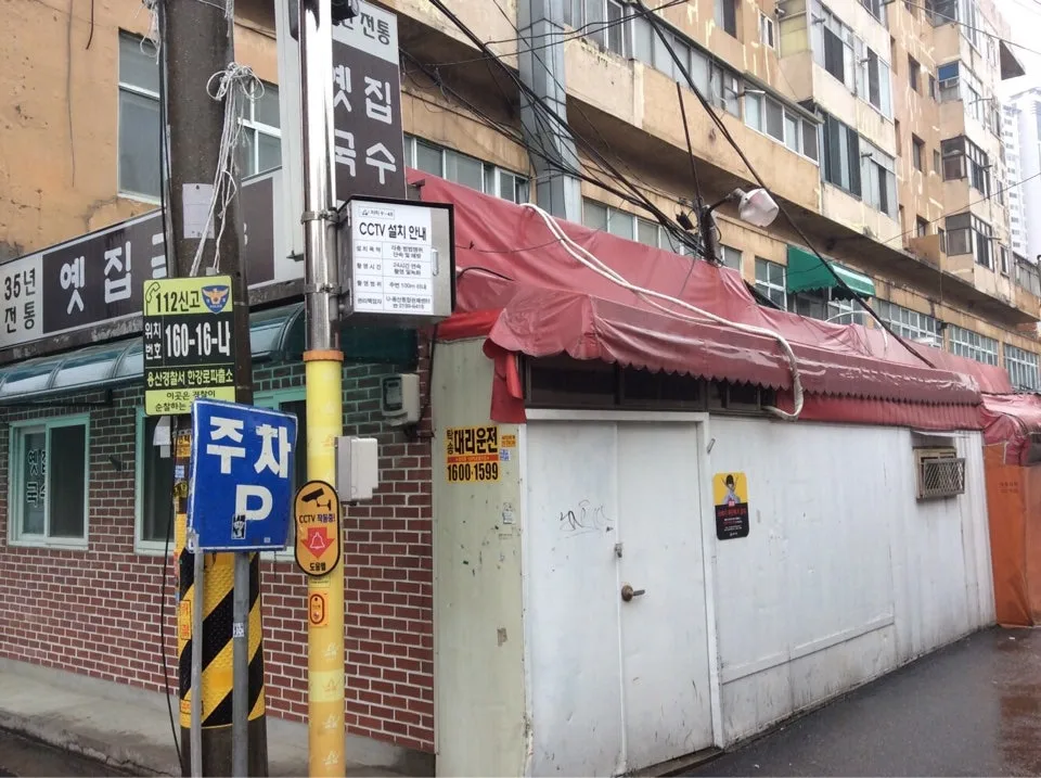 14번 출구 좌측 삼각지 뒷골목을 따라 걷는다. 단층 벽돌 건물에 ‘35년 전통 옛집국수 국수전문’ 간판이 보인다. 허름한 빨간 천막과 입구부터 노포의 분위기가 물씬하다.