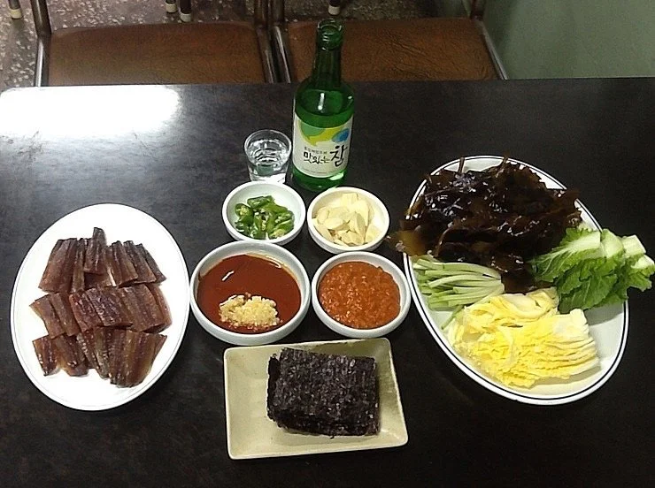 붉은 와인빛이 도는 쫀득한 살과 고소한 기름의 꽁치 과메기다. 참기름, 다진마늘 넣은 새콤 달금한 초고추장에 찍어 먹거나 고독고독 씹히는 미역, 시원하고 고소한 배춧속, 알싸한 쪽파, 봄동, 김, 마늘, 고추등을 곁들여 먹는다. 신선한 해조류, 채소와 함께 먹으면 과메기의 비릿함도 잡아주고 풍미도 한층 올려준다. 소주 한잔을 부르는 맛이다.