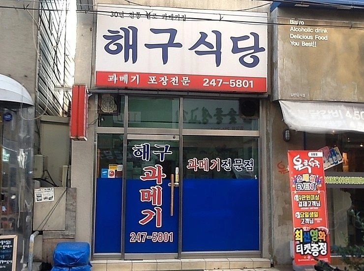 해구식당은 포항 죽도시장 안에서 40여년 넘게 영업한 과메기 노포이다. 직접 말린 과메기를 사용한다. 택배 판매를 위주로 해 식당 내부 공간 자리는 넓지 않다. 비릿한 과메기, 신선한 해조류, 새콤 달금한 초고추장의 어울림이 그만이다.