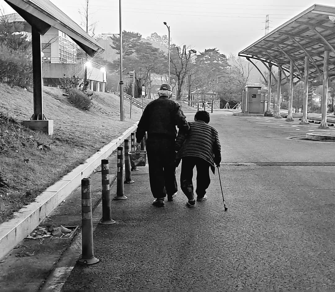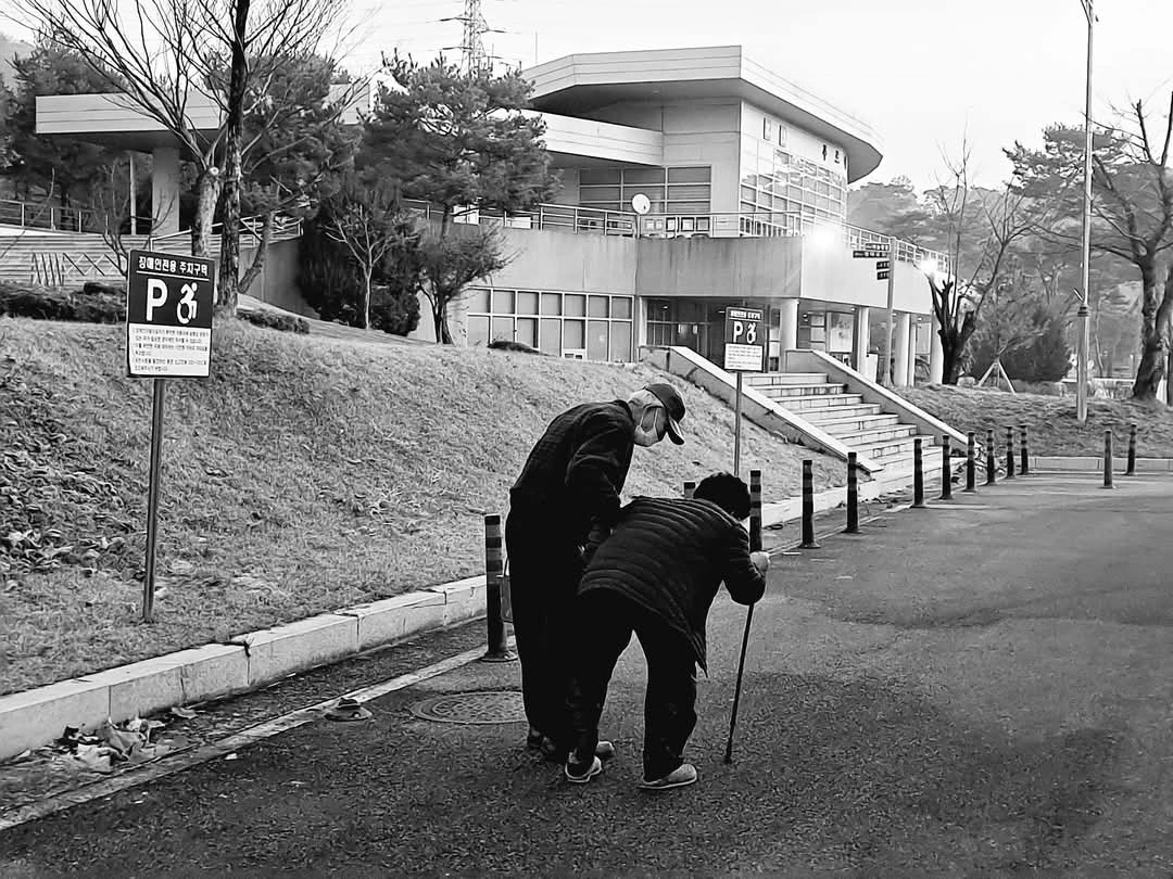 할아버지가 할머니를 부축해 걷는다.