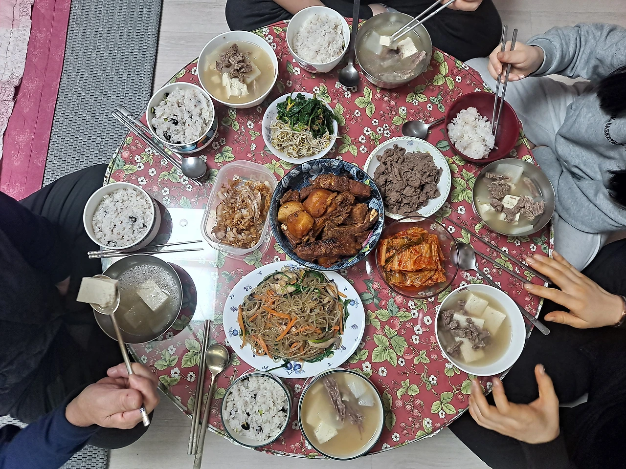 평소에는 의자에 앉아 네모난 식탁에서 식사한다. 2025년 설날 아침 밥상이다. 둥근 상에 음식을 차린다.