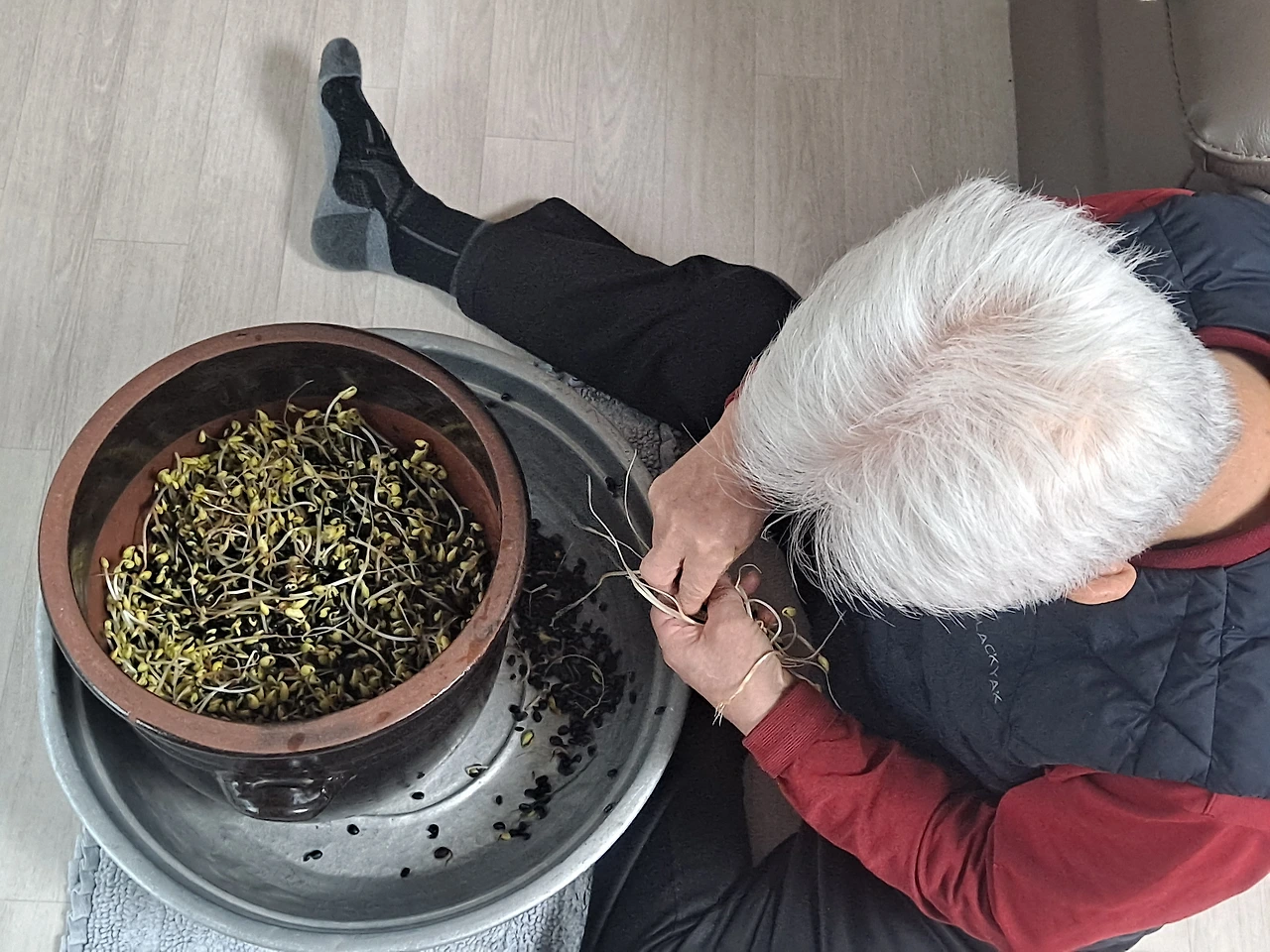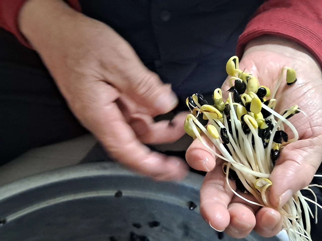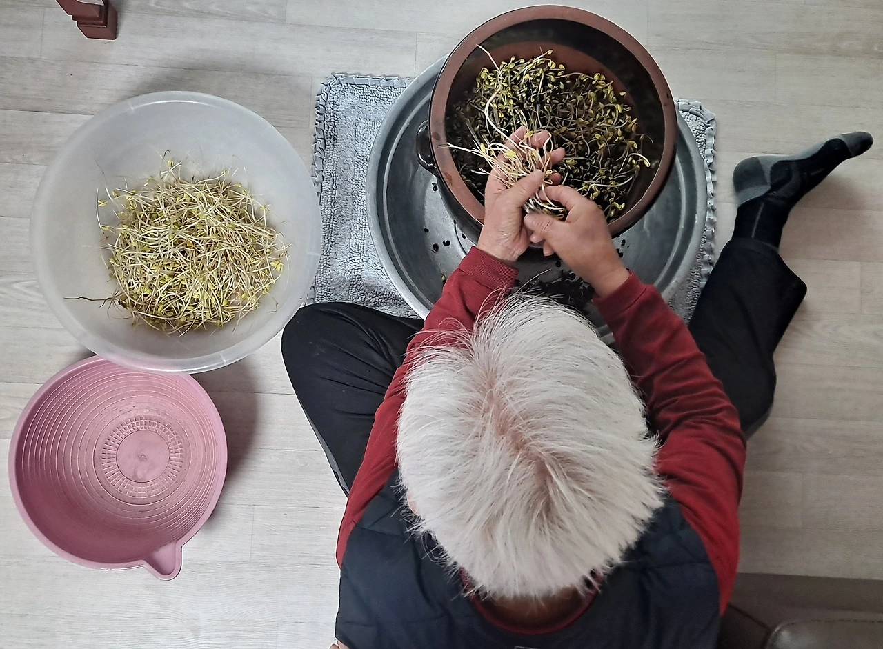 옹기 시루에 넣은 쥐눈이콩에 틈틈이 물을 주어 키운 콩나물이다.