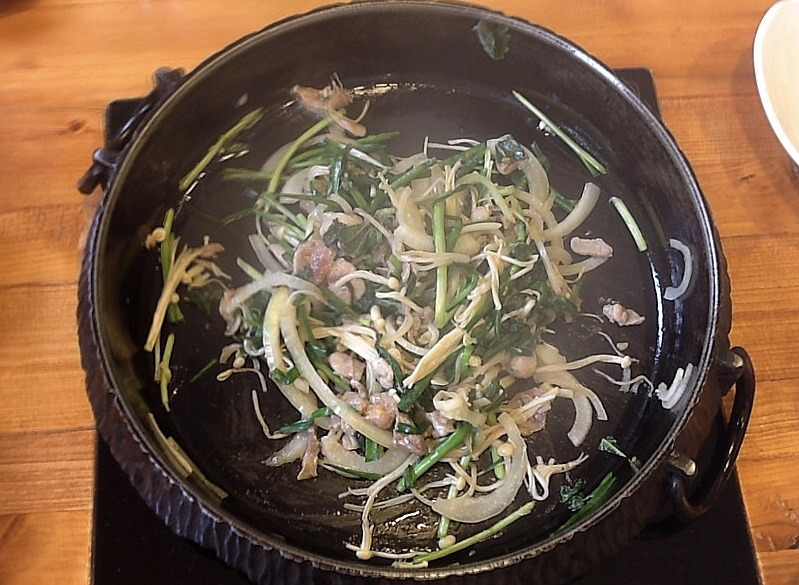 꿩 회와 꿩토렴을 오가며 맛을 본다. 접시에 붉은색 두 줄은 사라지고 하얀 무채만이 덩그러니 남는다. 꿩토렴을 한 국물은 나중에 수제비를 넣어서 먹는다. 불을 줄여 끓인다.