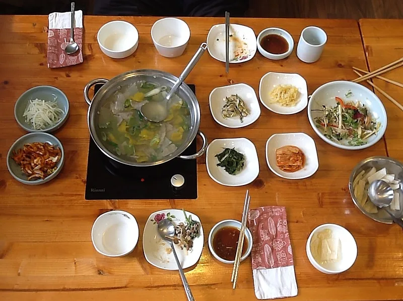 꿩 요리 2인분을 주문한다. 식탁에 무생채와 채소무침이 찬으로 나오고 앉은 자리마다 동치미와 양념장이 놓인다.